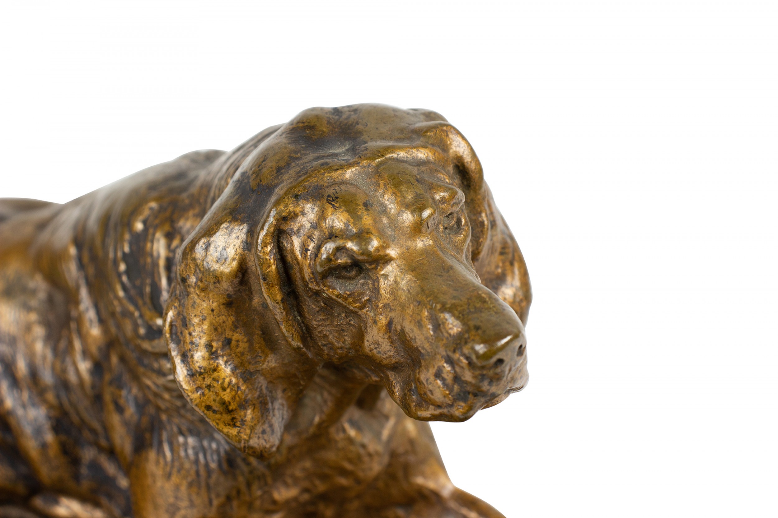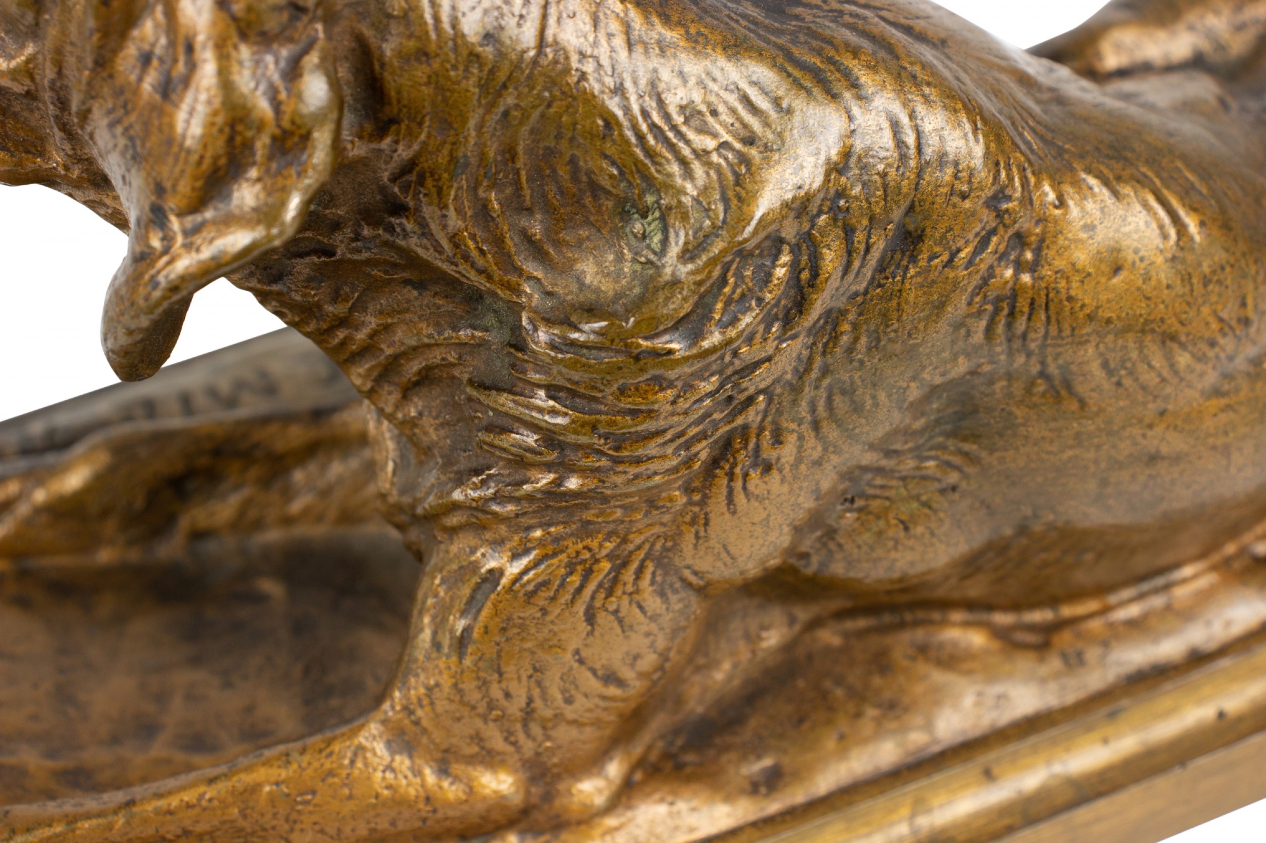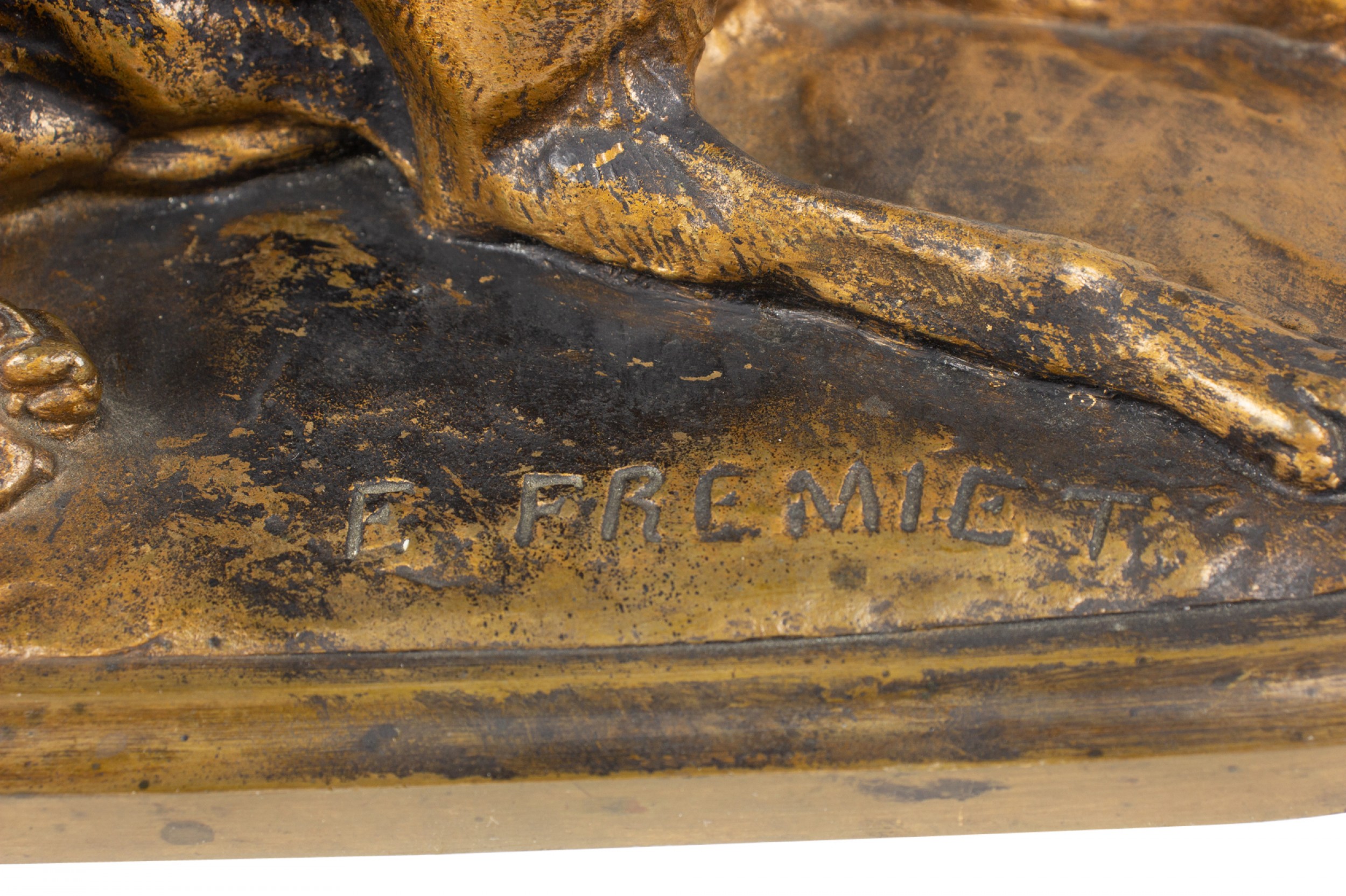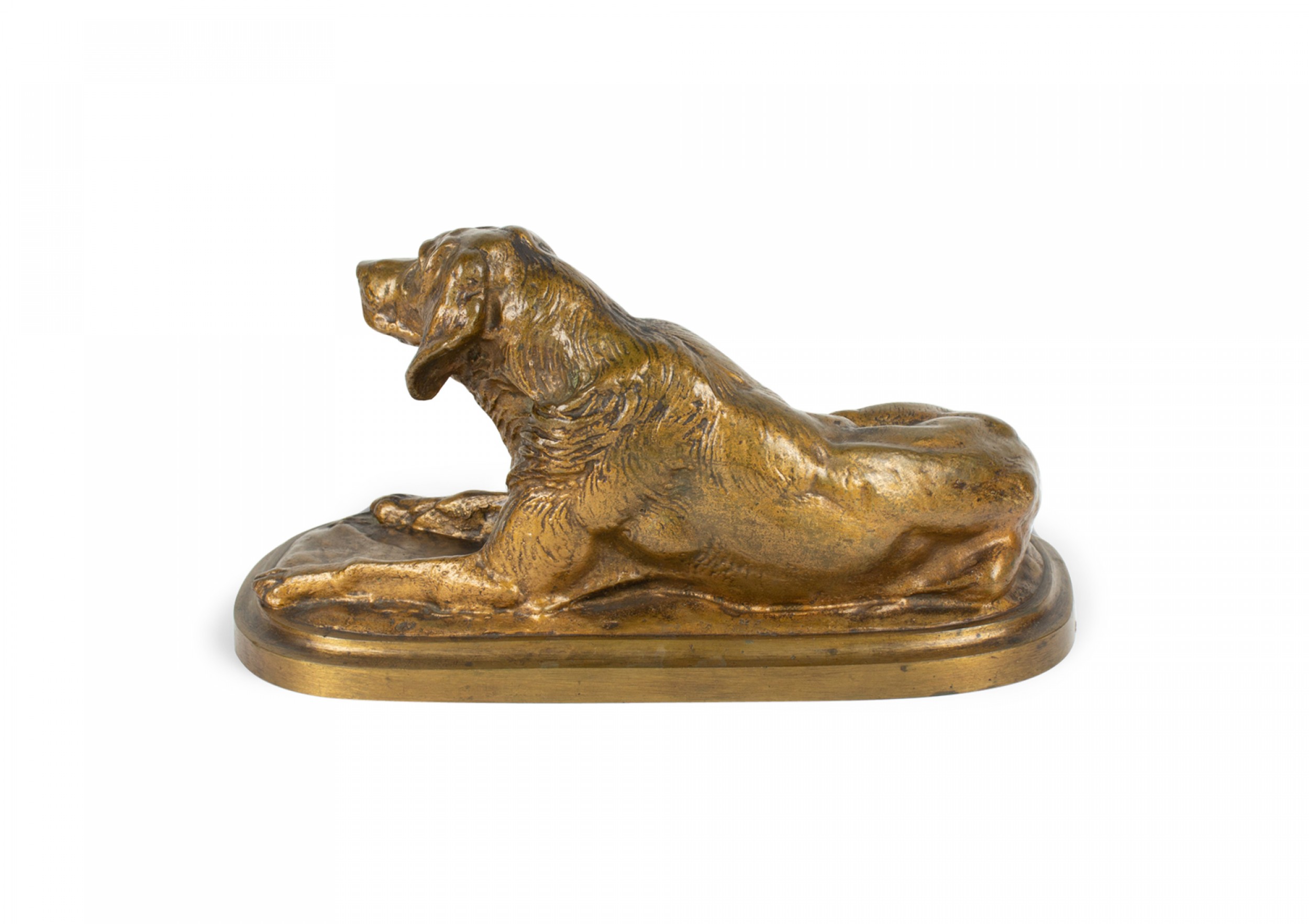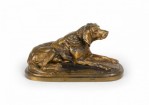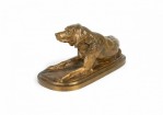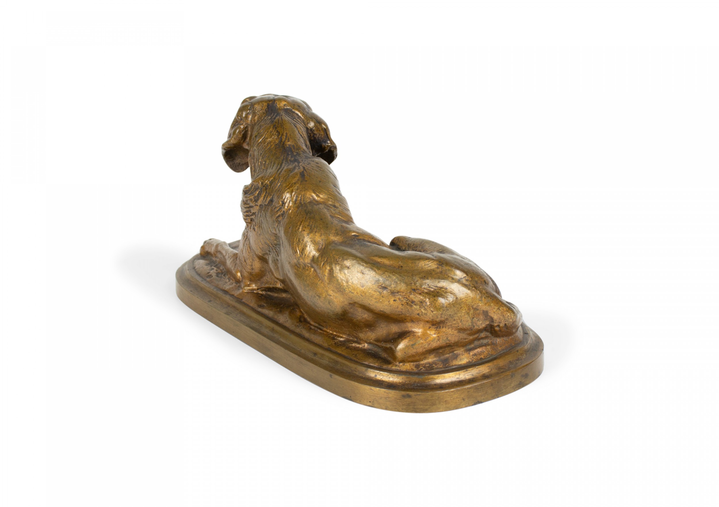 French Victorian bronze figure of reclining dog on oval shaped base (signed FREMIET)