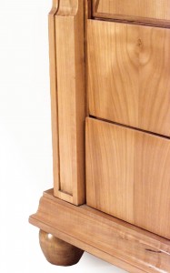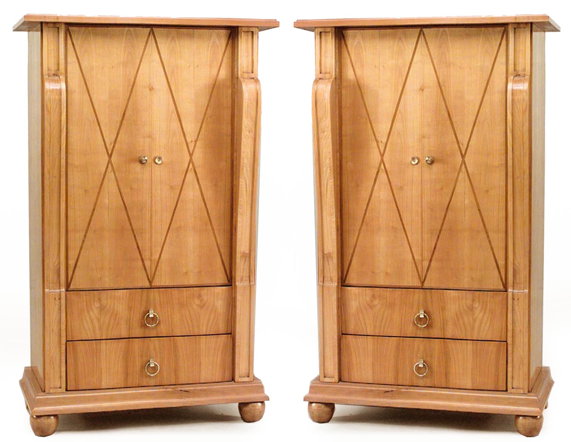 PAIR of French 1940s maple cabinets with a pair of "X" inlaid design doors over 2 drawers with bronze drawer pulls flanked by scroll headed columns (attributed to ANDRE ARBUS) (PRICED AS PAIR).