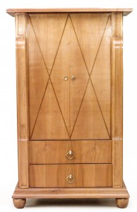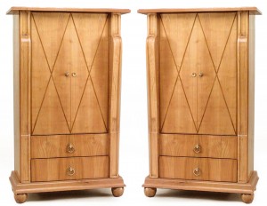 PAIR of French 1940s maple cabinets with a pair of "X" inlaid design doors over 2 drawers with bronze drawer pulls flanked by scroll headed columns (attributed to ANDRE ARBUS) (PRICED AS PAIR)..