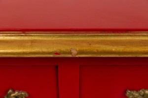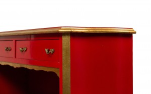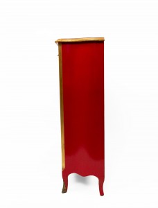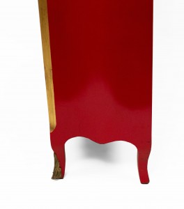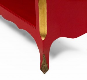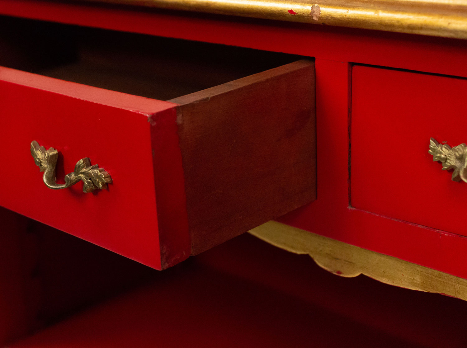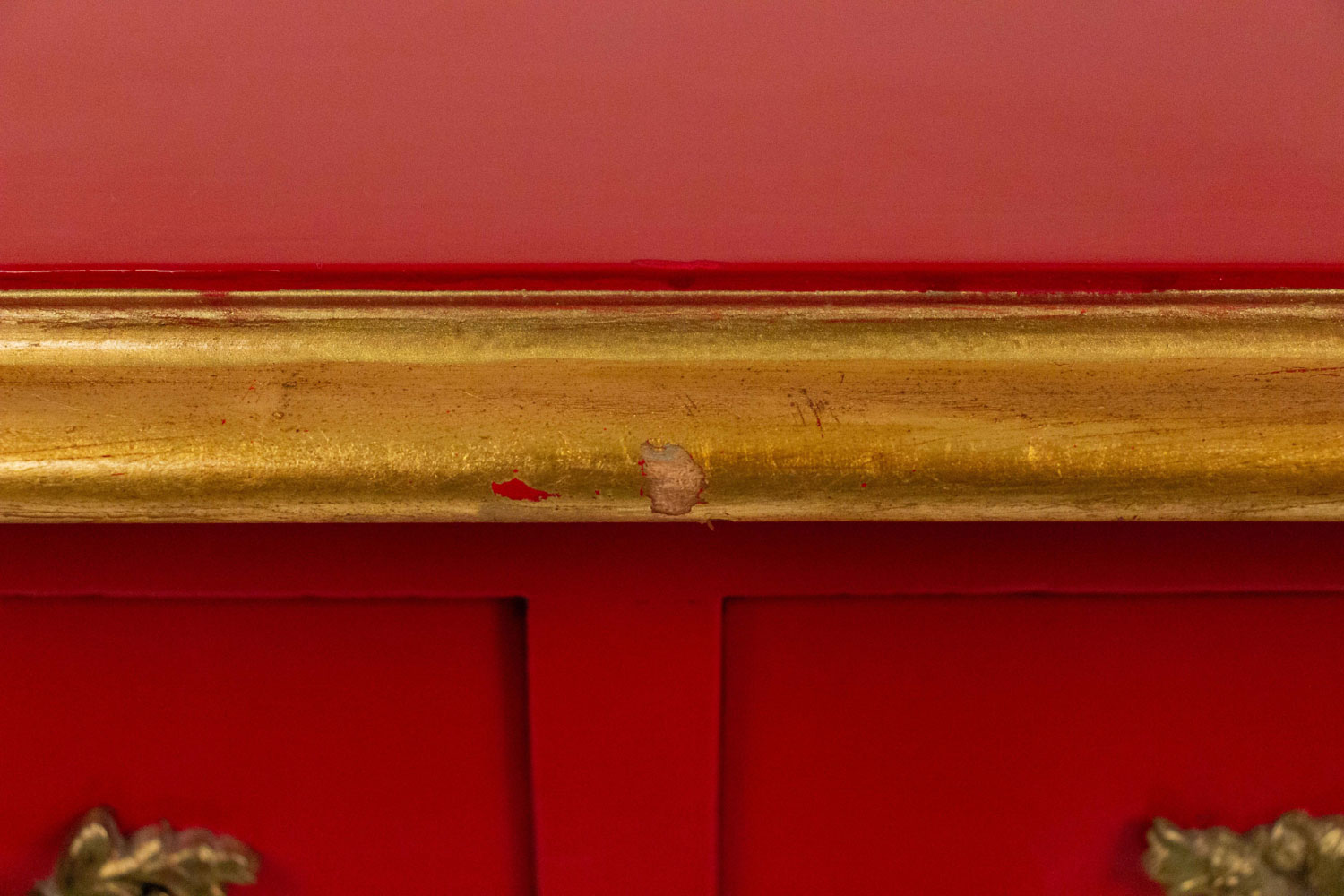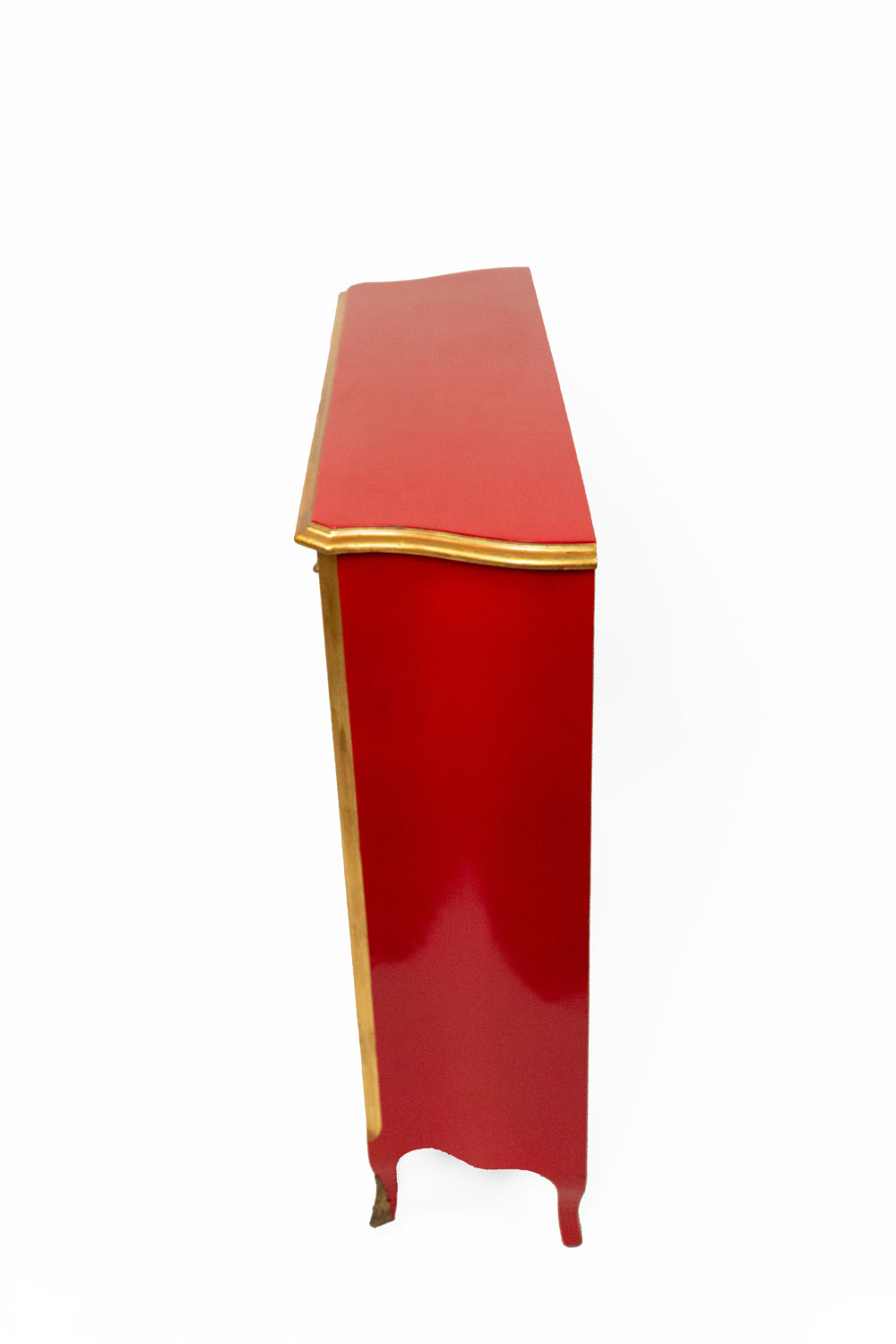 French Louis XV-style (1940s) red lacquered and gilt trimmed bookcase with 2 drawers above 3 shelves with a shaped top and bronze sabot feet. (Stamped: JANSEN)