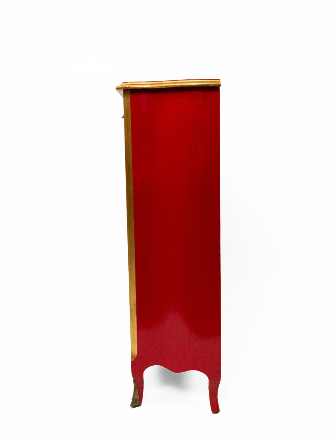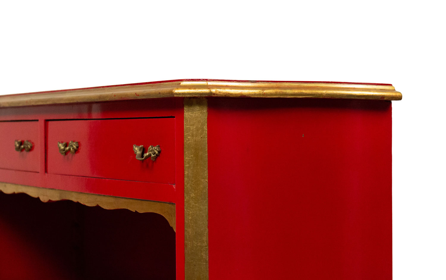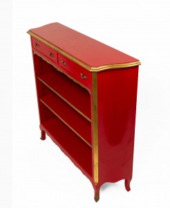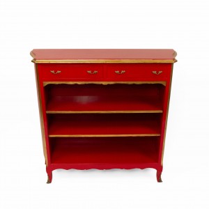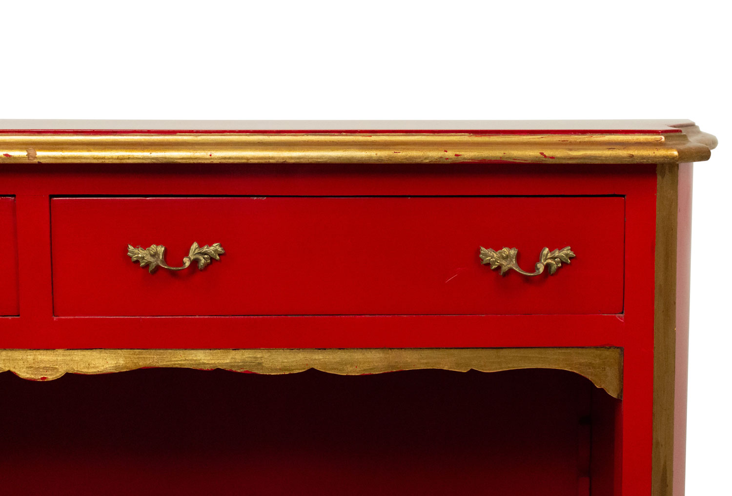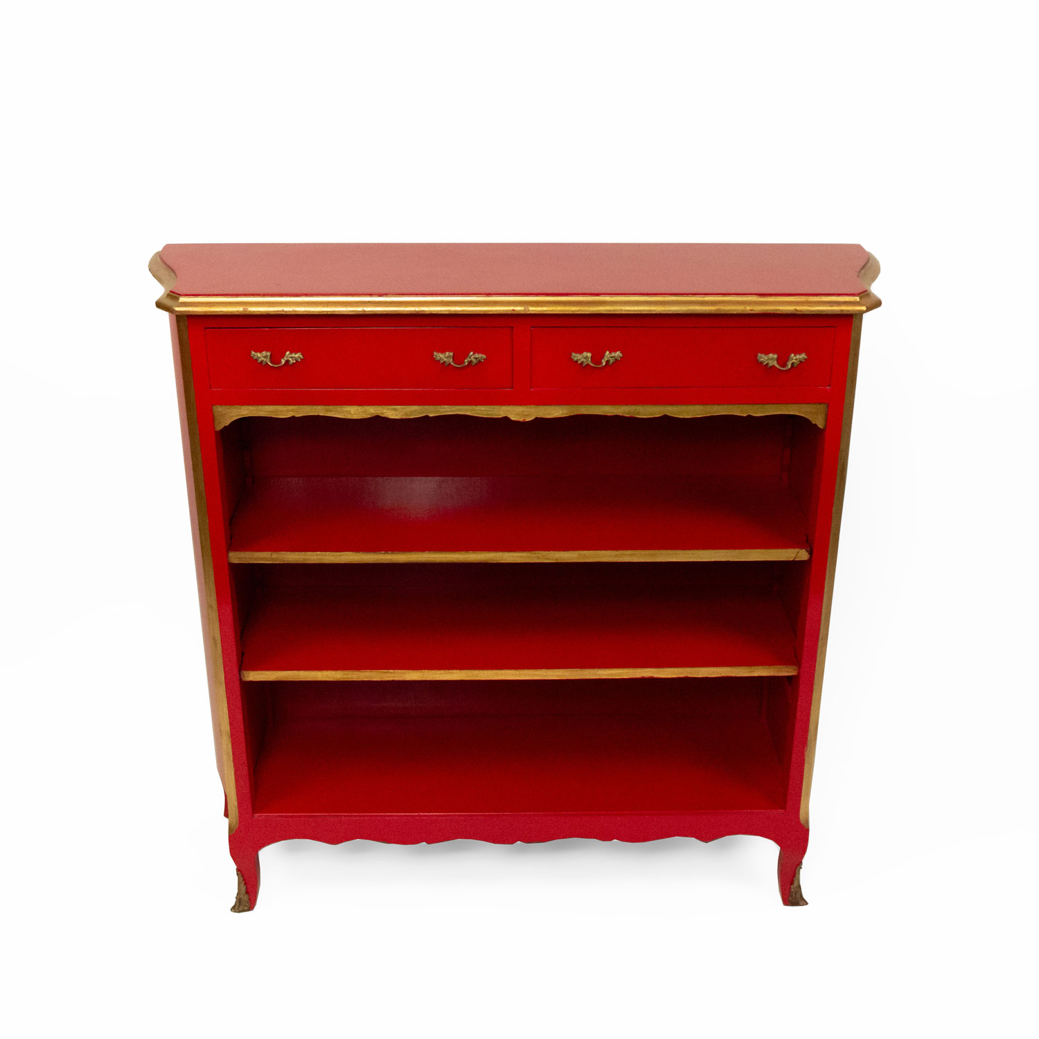 French Louis XV-style (1940s) red lacquered and gilt trimmed bookcase with 2 drawers above 3 shelves with a shaped top and bronze sabot feet. (Stamped: JANSEN).