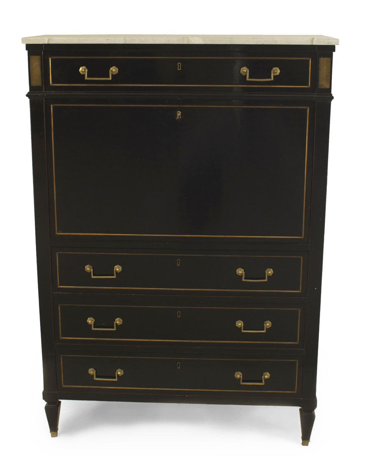 French Louis XVI-style (1940s) ebonized & bronze trim abbatant form desk with a drop front interior above 3 drawers and below a single drawer & a white marble top. (stamped: JANSEN)