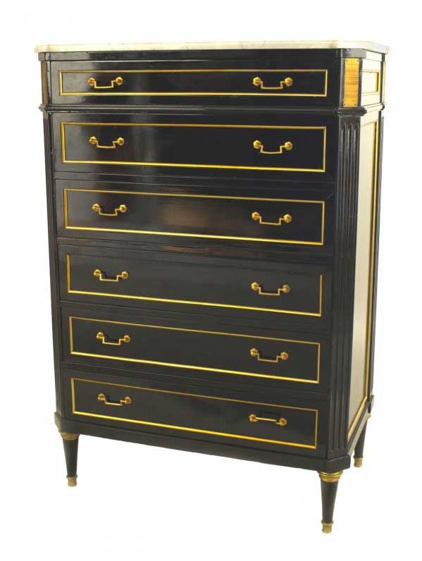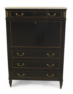 French Louis XVI-style (1940s) ebonized & bronze trim abbatant form desk with a drop front interior above 3 drawers and below a single drawer & a white marble top. (stamped: JANSEN).