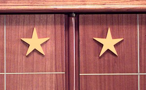 French Mid-Century (1940s) cherrywood high sideboard cabinet with line inlay and applied white painted carved stars and raised on 6 legs (Attributed to DOMINIQUE)