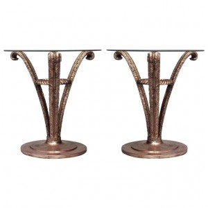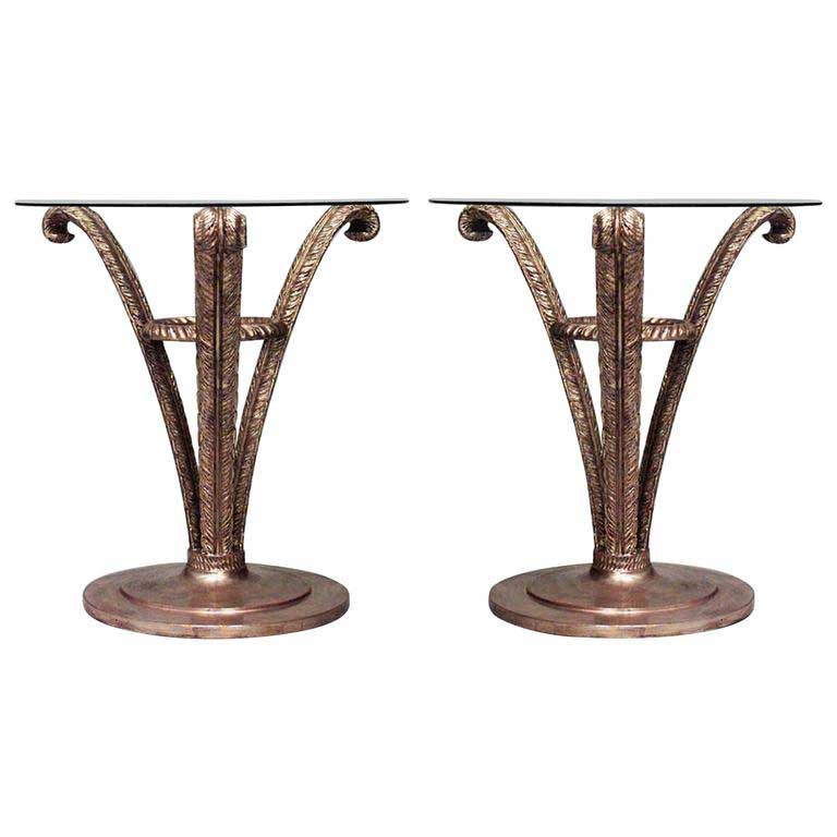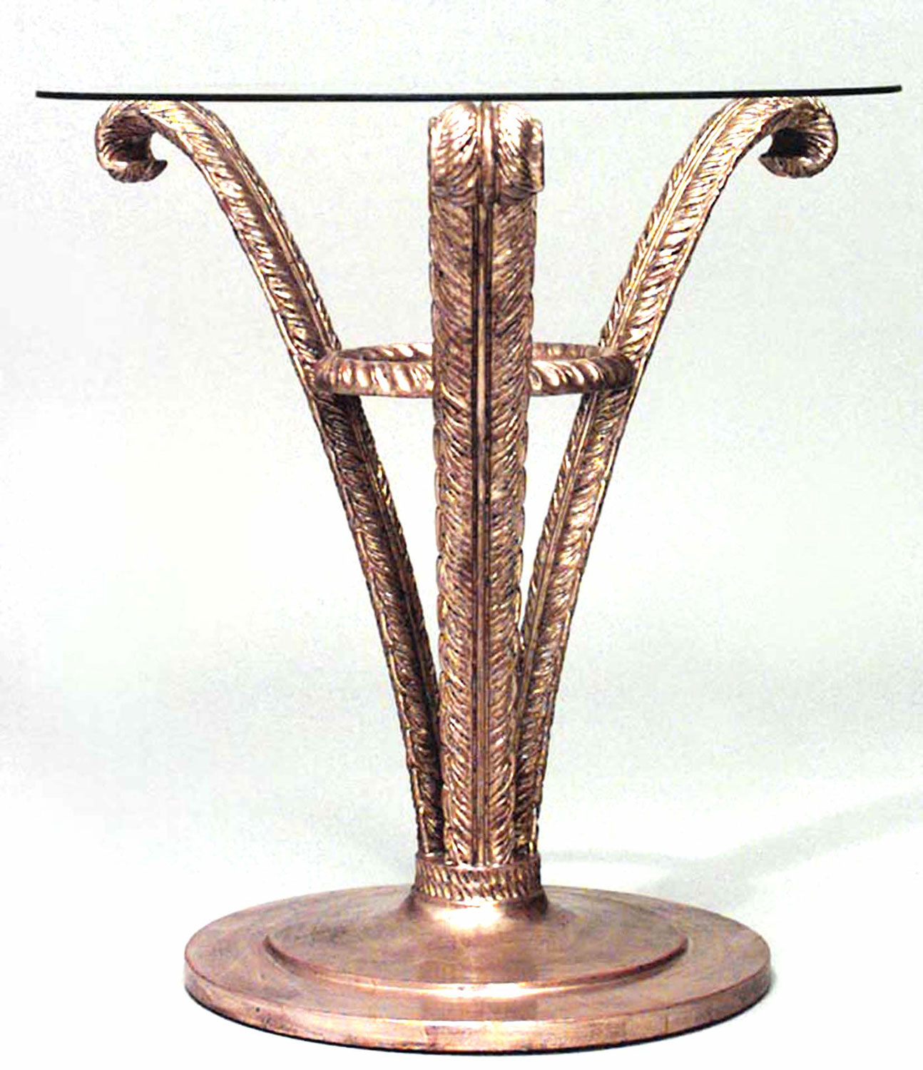 PAIR of French Mid-Century (1940s) gilt end tables with triple plume base and round glass top. (NEEDS GILT RESTORATION) (Attributed to GROSFELD HOUSE) (PRICED AS PAIR)