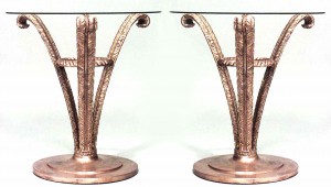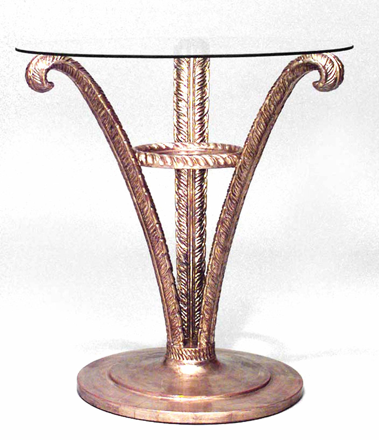 PAIR of French Mid-Century (1940s) gilt end tables with triple plume base and round glass top. (NEEDS GILT RESTORATION) (Attributed to GROSFELD HOUSE) (PRICED AS PAIR).