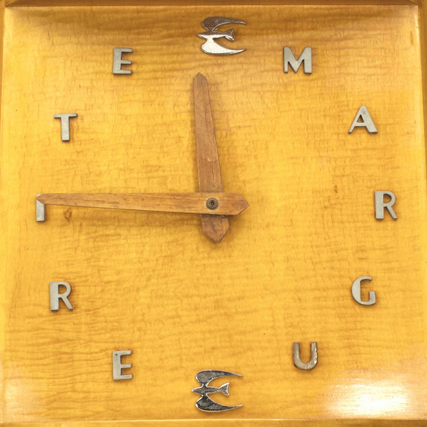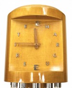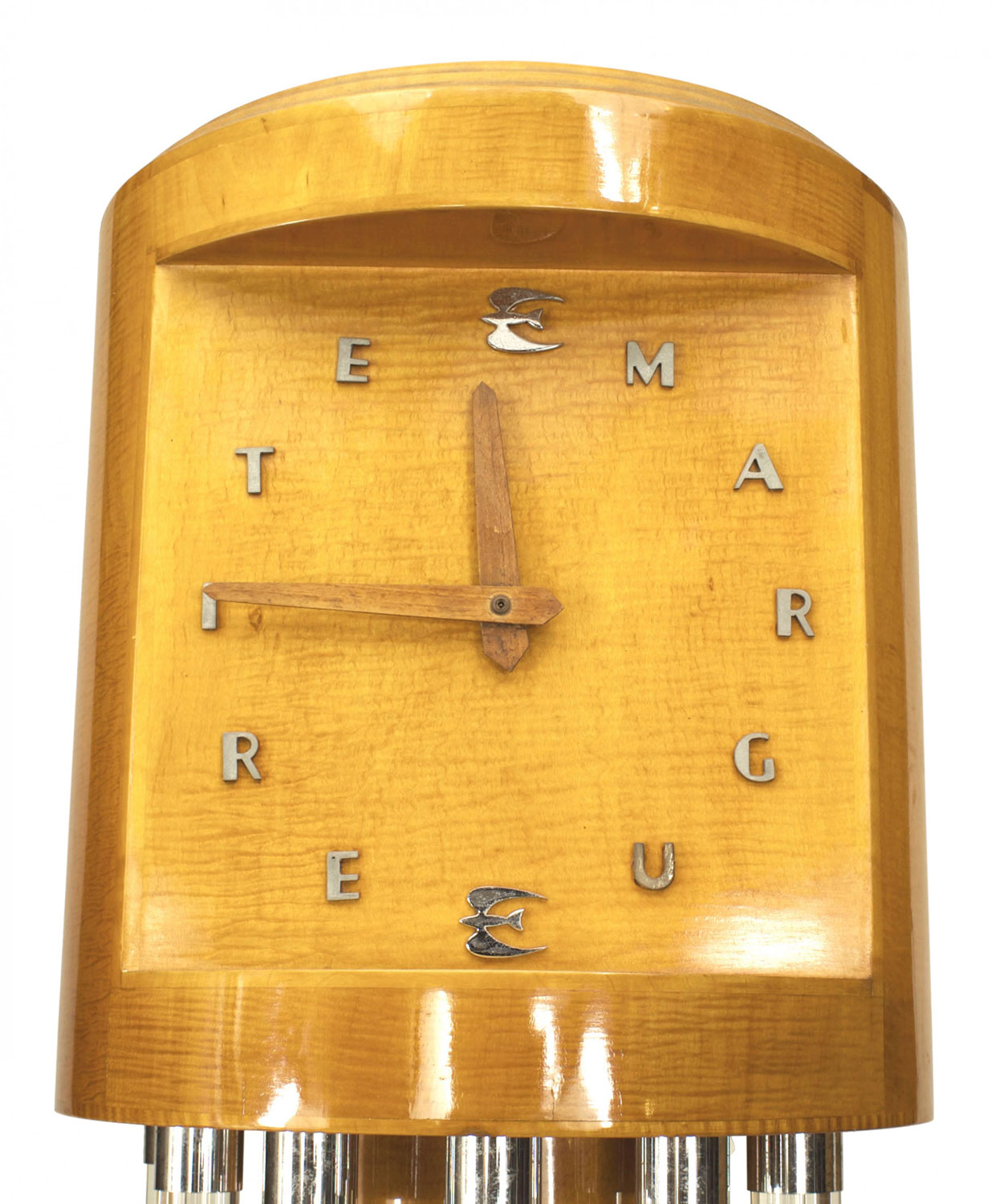 French Mid-Century (1940s) maple grandfather clock with Lucite column and chrome design with "MARGUERITE" clock face (Not working)