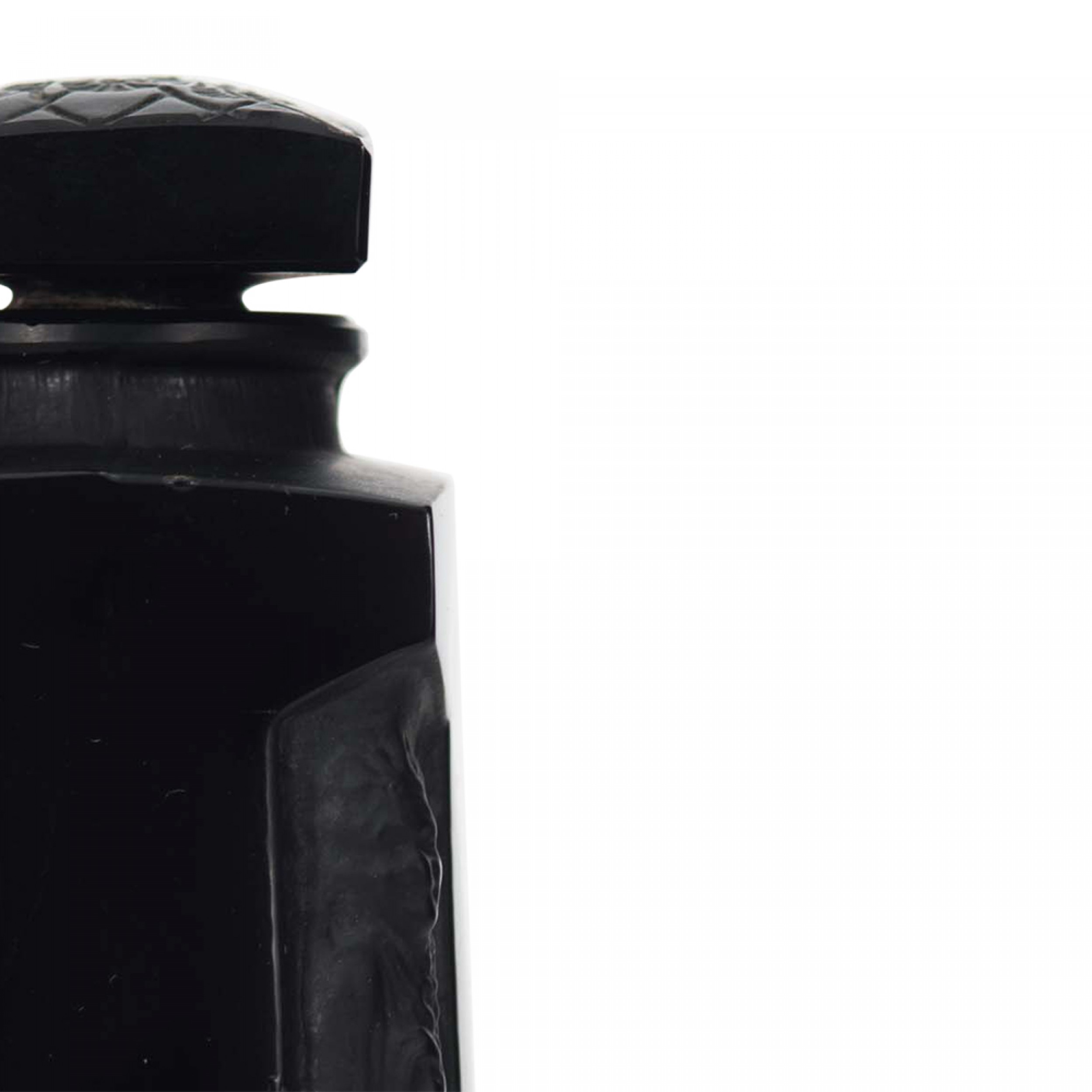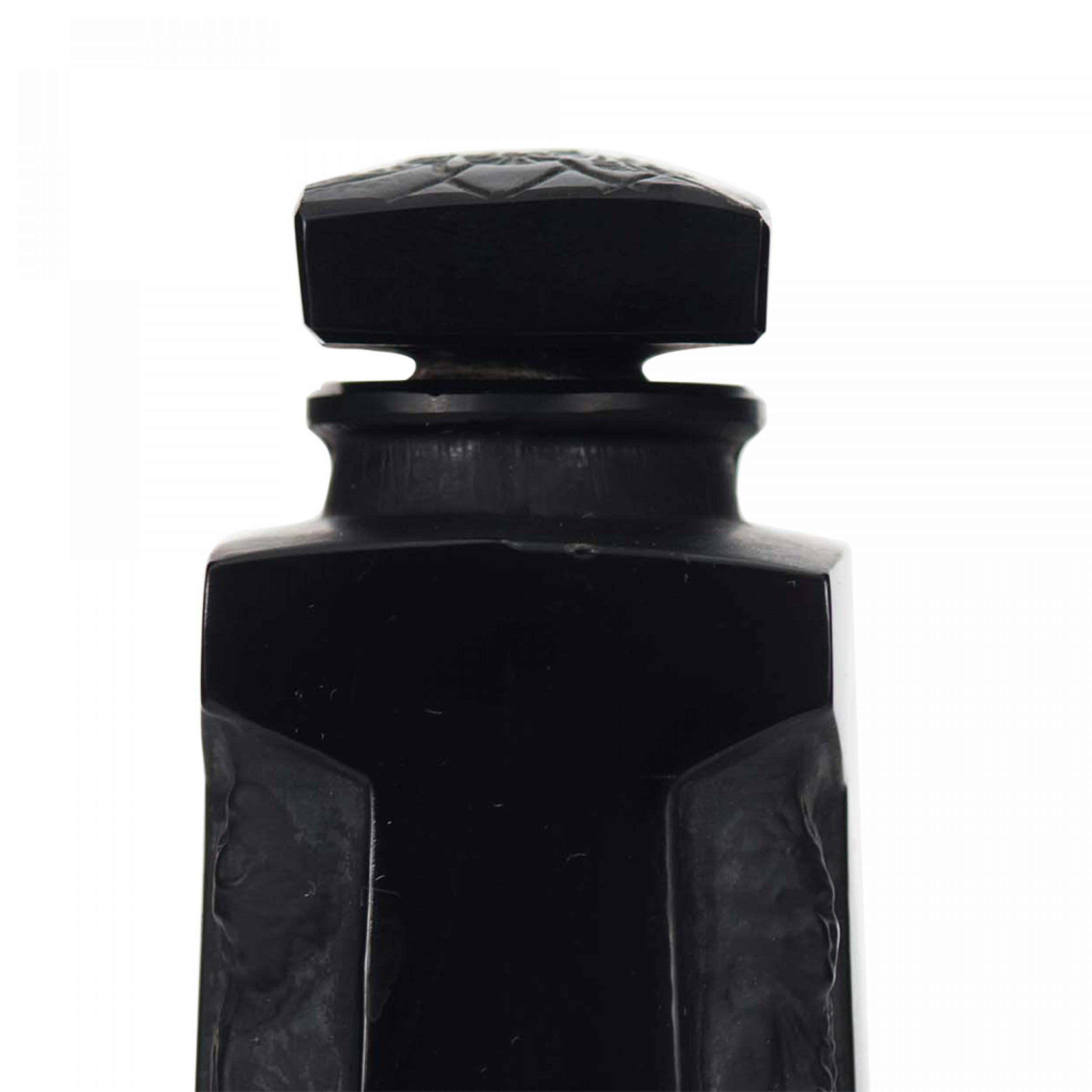 French Art Deco tall four-sided black glass perfume bottle (AMBRE D'ORSAY by D'ORSAY) decorated with recessed robed woman figures at each of the four corners, under a square stopper with indented flowers (signed LALIQUE).