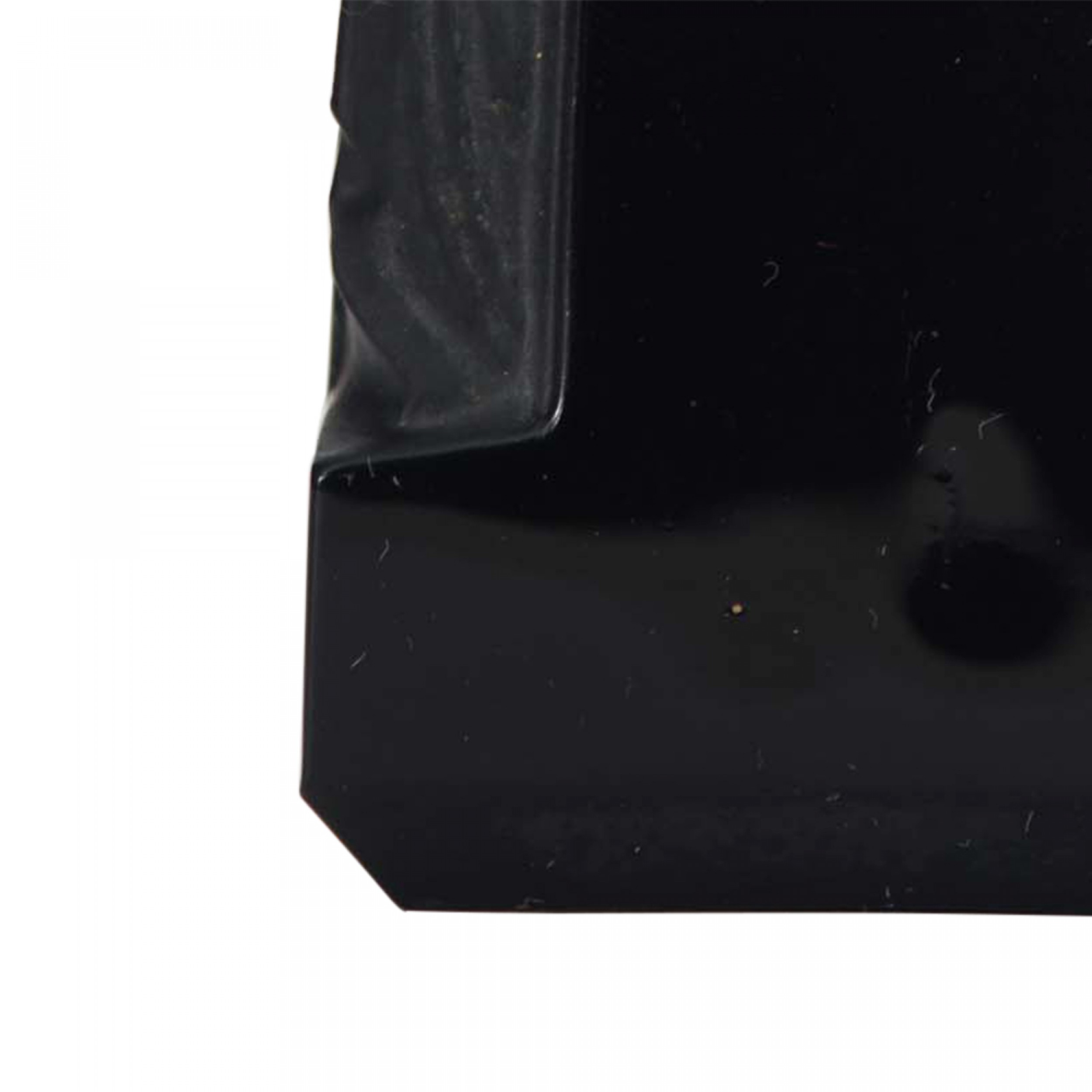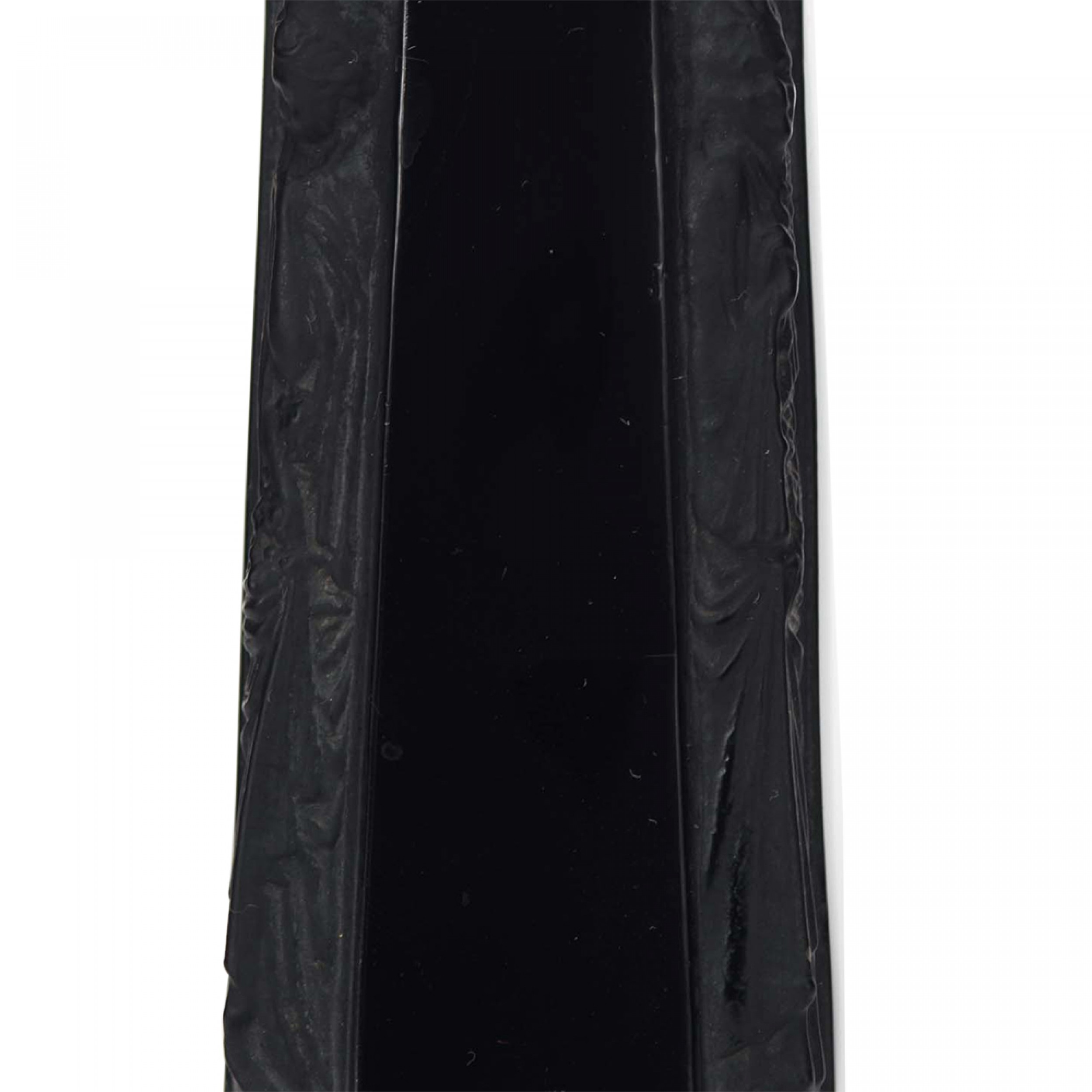French Art Deco tall four-sided black glass perfume bottle (AMBRE D'ORSAY by D'ORSAY) decorated with recessed robed woman figures at each of the four corners, under a square stopper with indented flowers (signed LALIQUE)