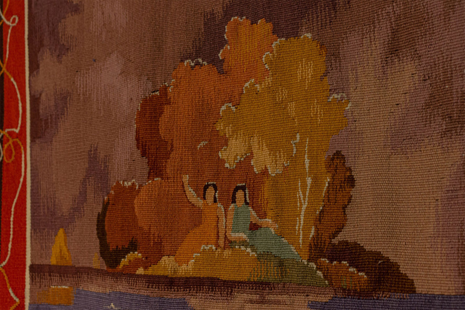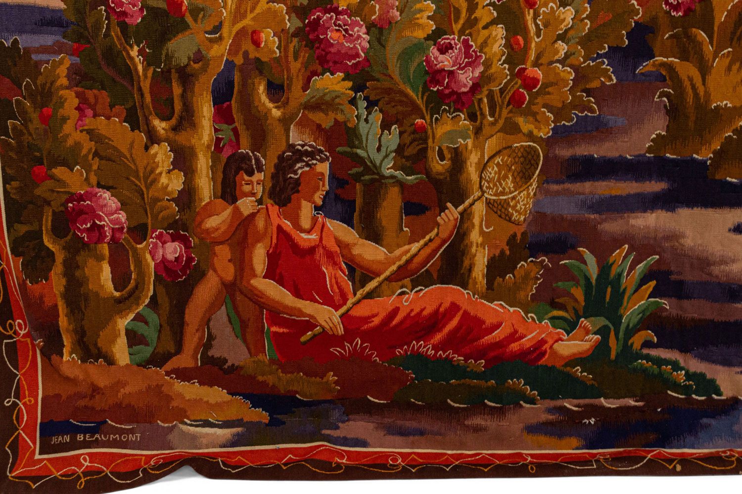 French Art Deco Aubusson tapestry with figural scene. Exhibited at Louvre, Paris #26 in 1950 Exposition (signed JEAN BEAUMONT, 1926 by Tapisseries et Cartons Des Ateliers A.R.T.)