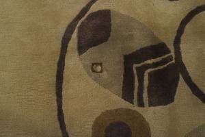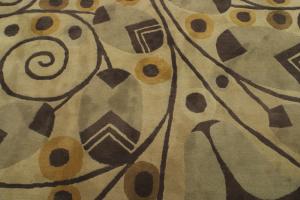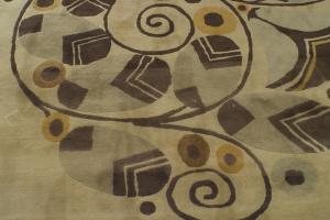 French Art Deco style monumental carpet with a light beige border and an oval center pattern of scrolls and oval forms in various shades of brown (12.75 x 24.25')