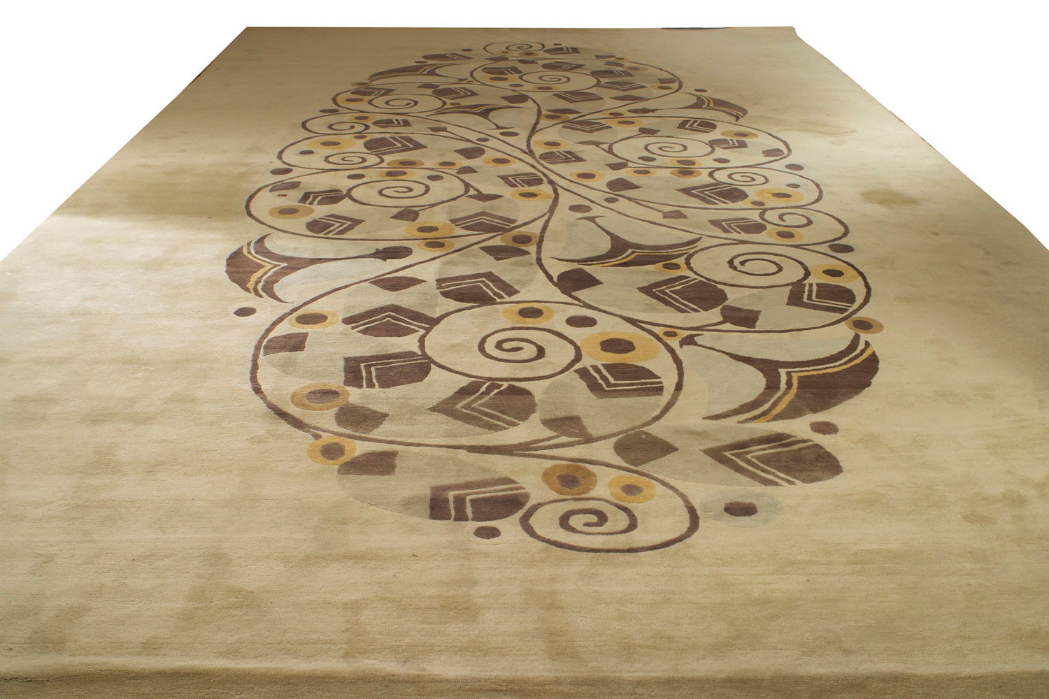 French Art Deco style monumental carpet with a light beige border and an oval center pattern of scrolls and oval forms in various shades of brown (12.75 x 24.25').