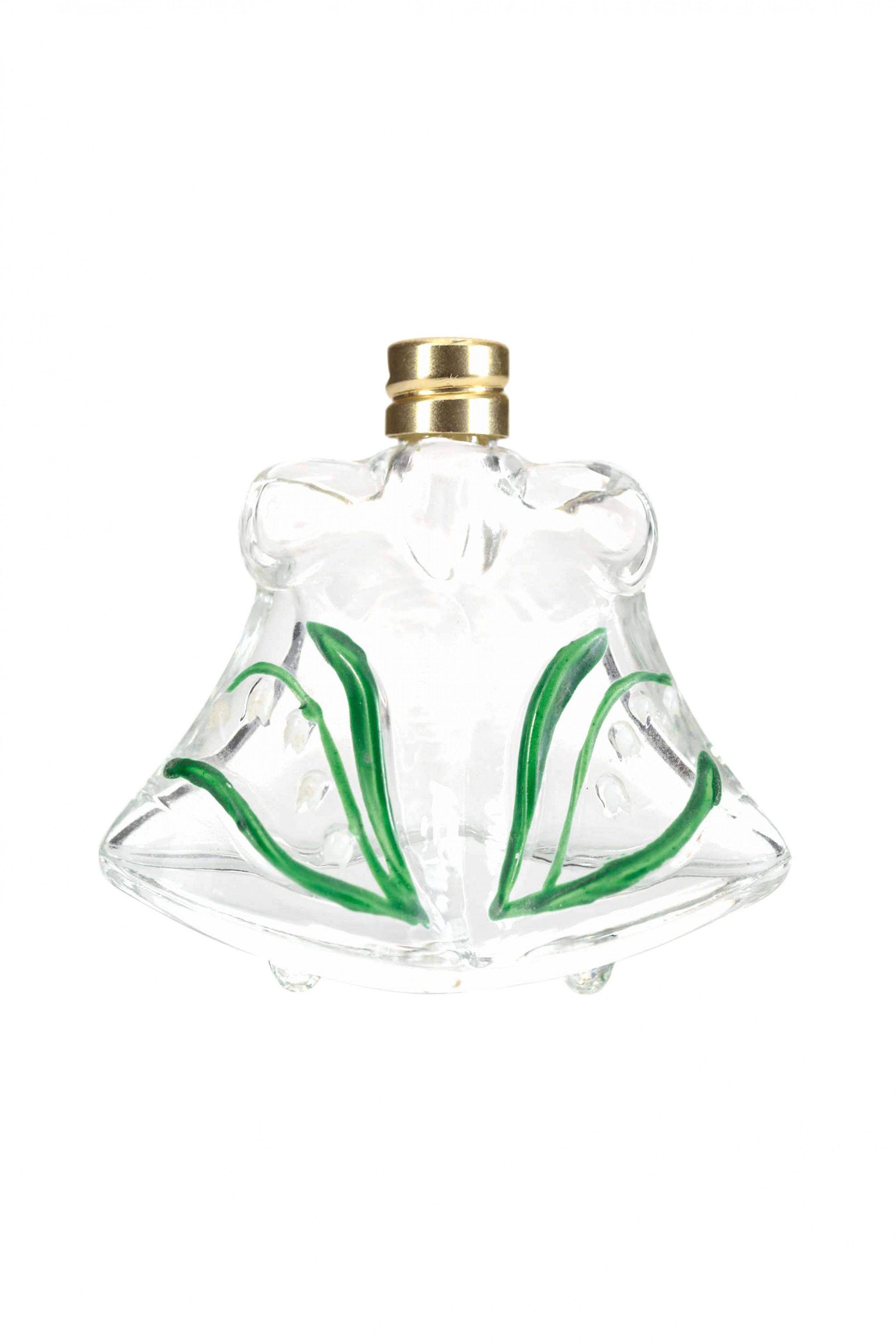 French Art Deco small clear glass perfume bottle shaped like two bells tied in a bow, with a painted green and white design and a gold metal twist-off cap.
