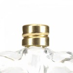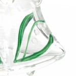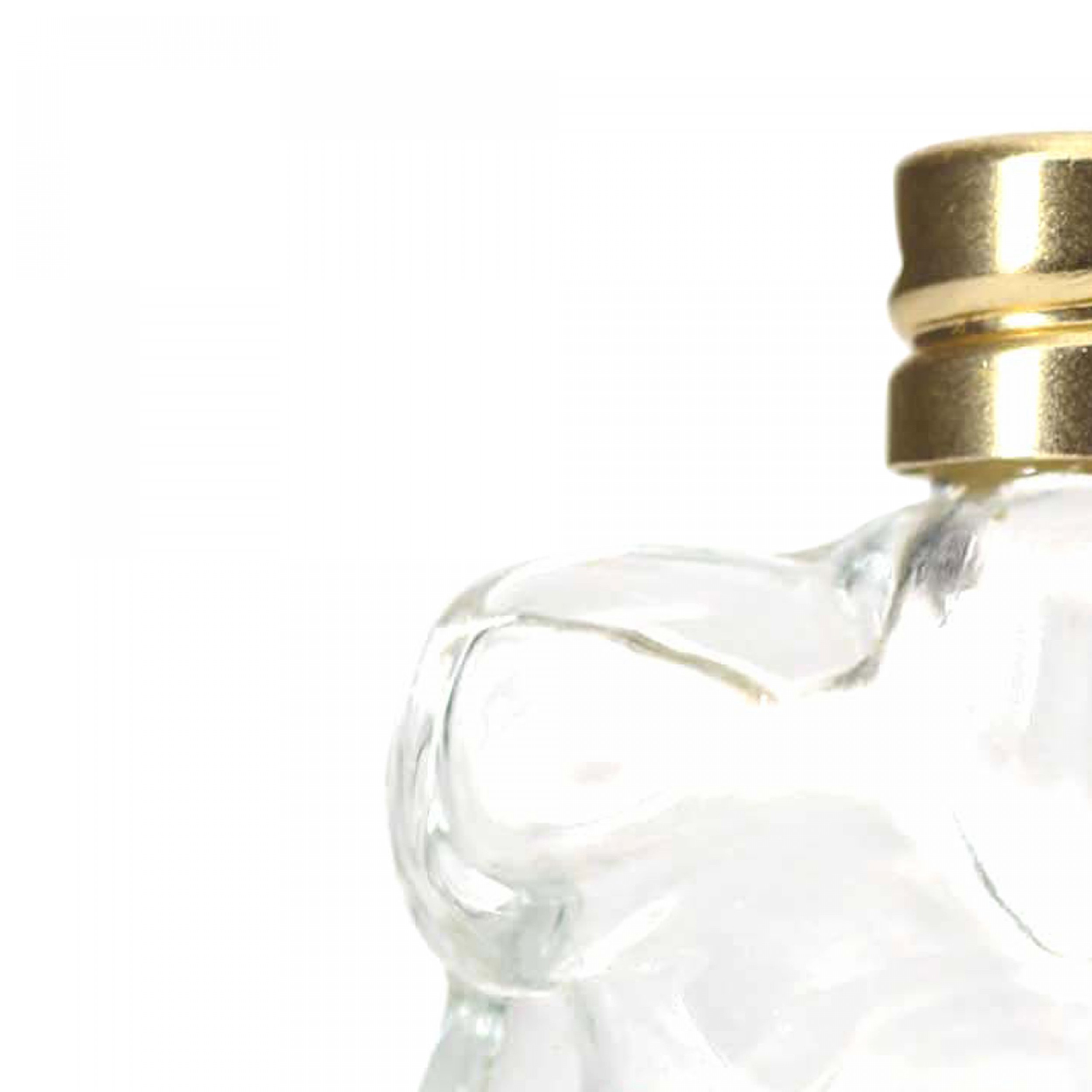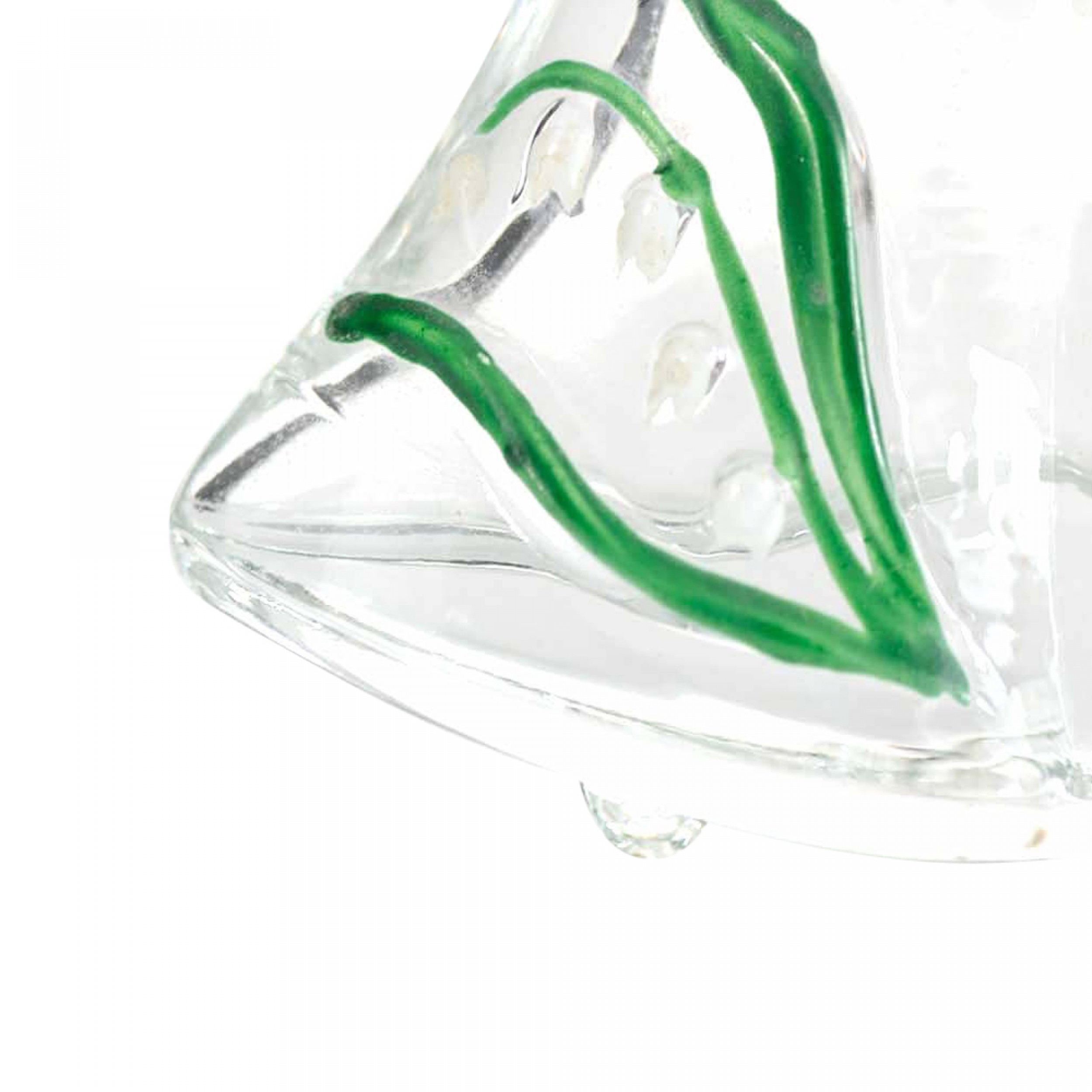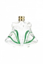 French Art Deco small clear glass perfume bottle shaped like two bells tied in a bow, with a painted green and white design and a gold metal twist-off cap..
