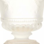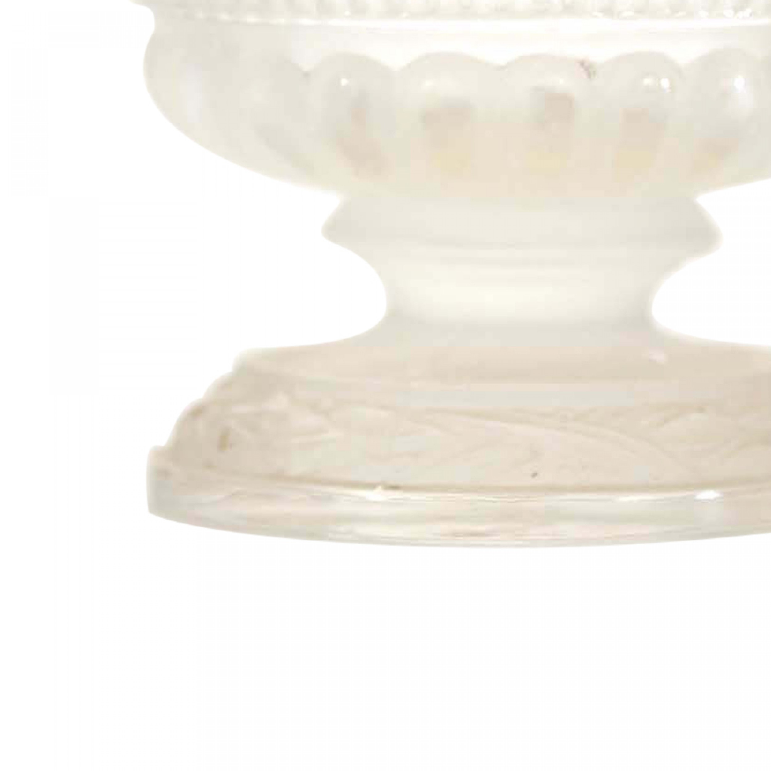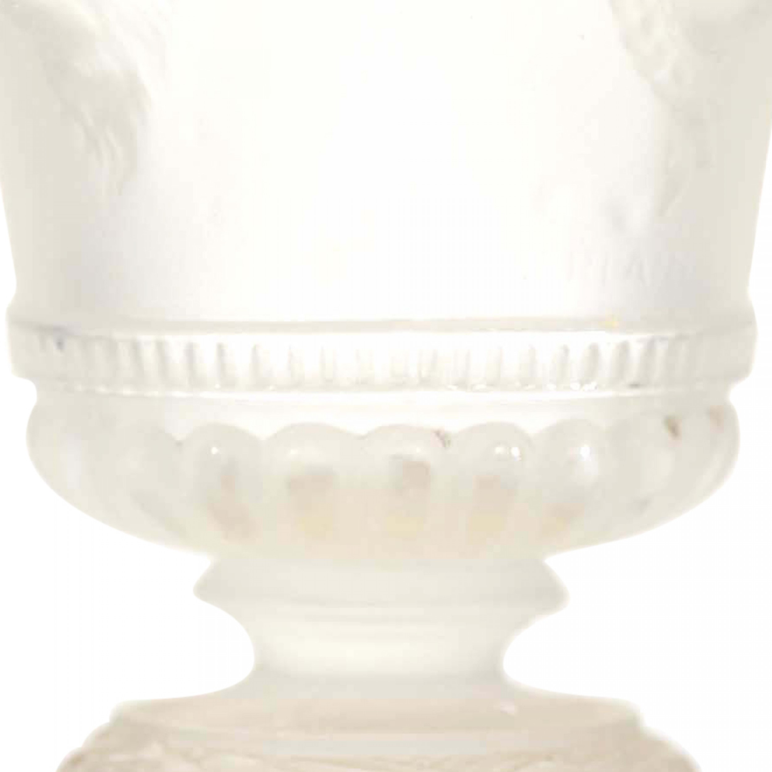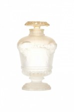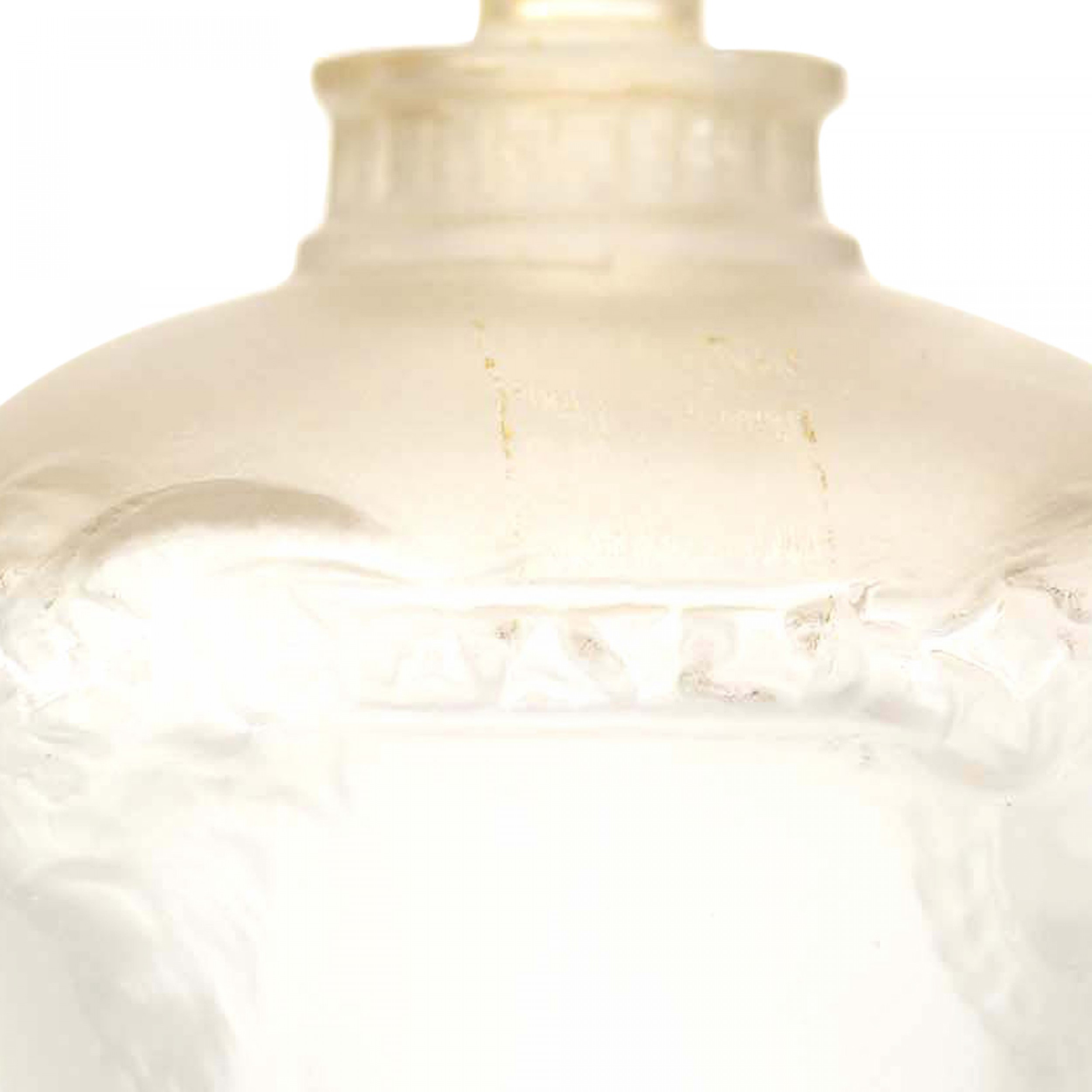 French Art Deco footed urn shaped frosted glass perfume bottle (BOUQET DE FAUNES by GUERLAIN) with four mythical faun heads in high relief around the body, and a flattened stopper with embossed beaded design, a scalloped edge and four pierced holes..