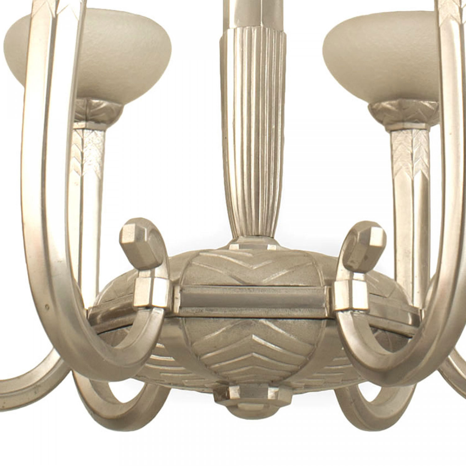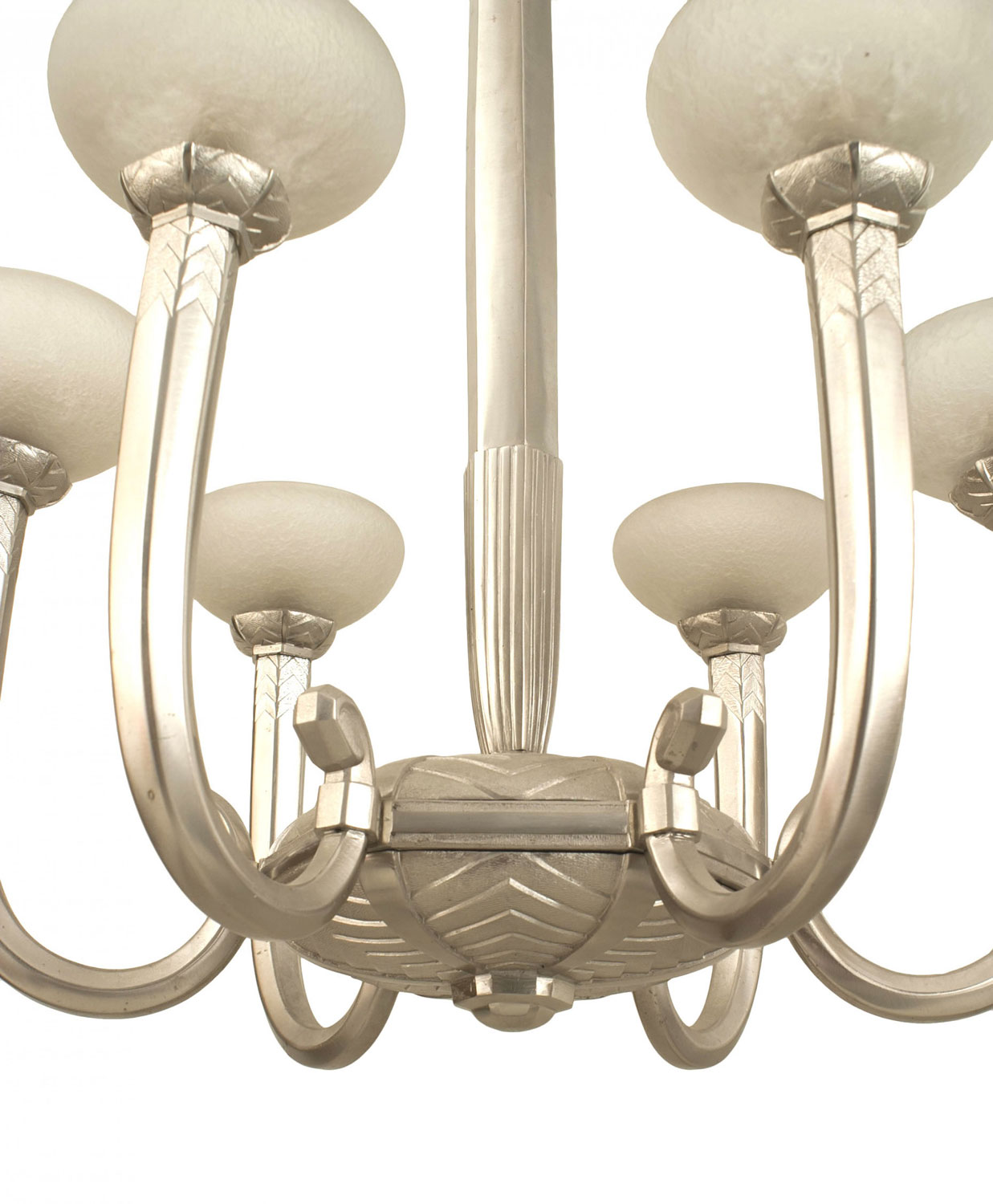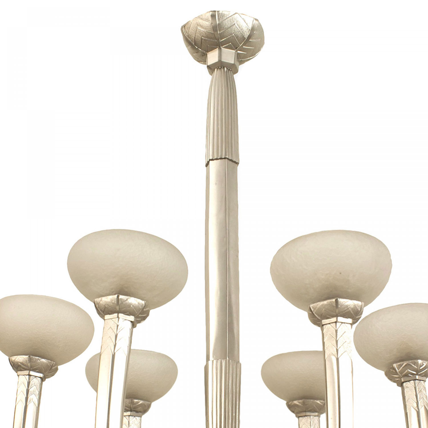 French Art Deco (circa 1930) silvered bronze 6 arm chandelier supporting acid etched glass shades emanating from a geometric design center & center post (Glass attributed to SCHNEIDER)