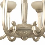 French Art Deco (circa 1930) silvered bronze 6 arm chandelier supporting acid etched glass shades emanating from a geometric design center & center post (Glass attributed to SCHNEIDER).