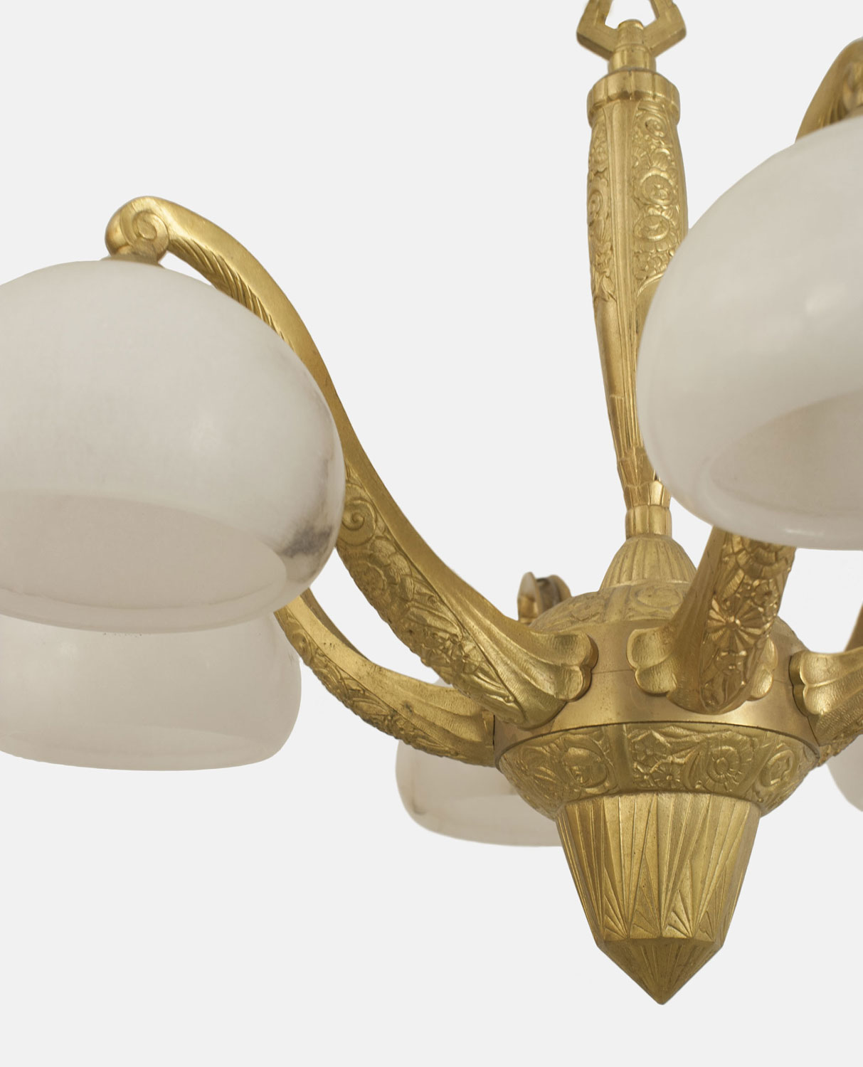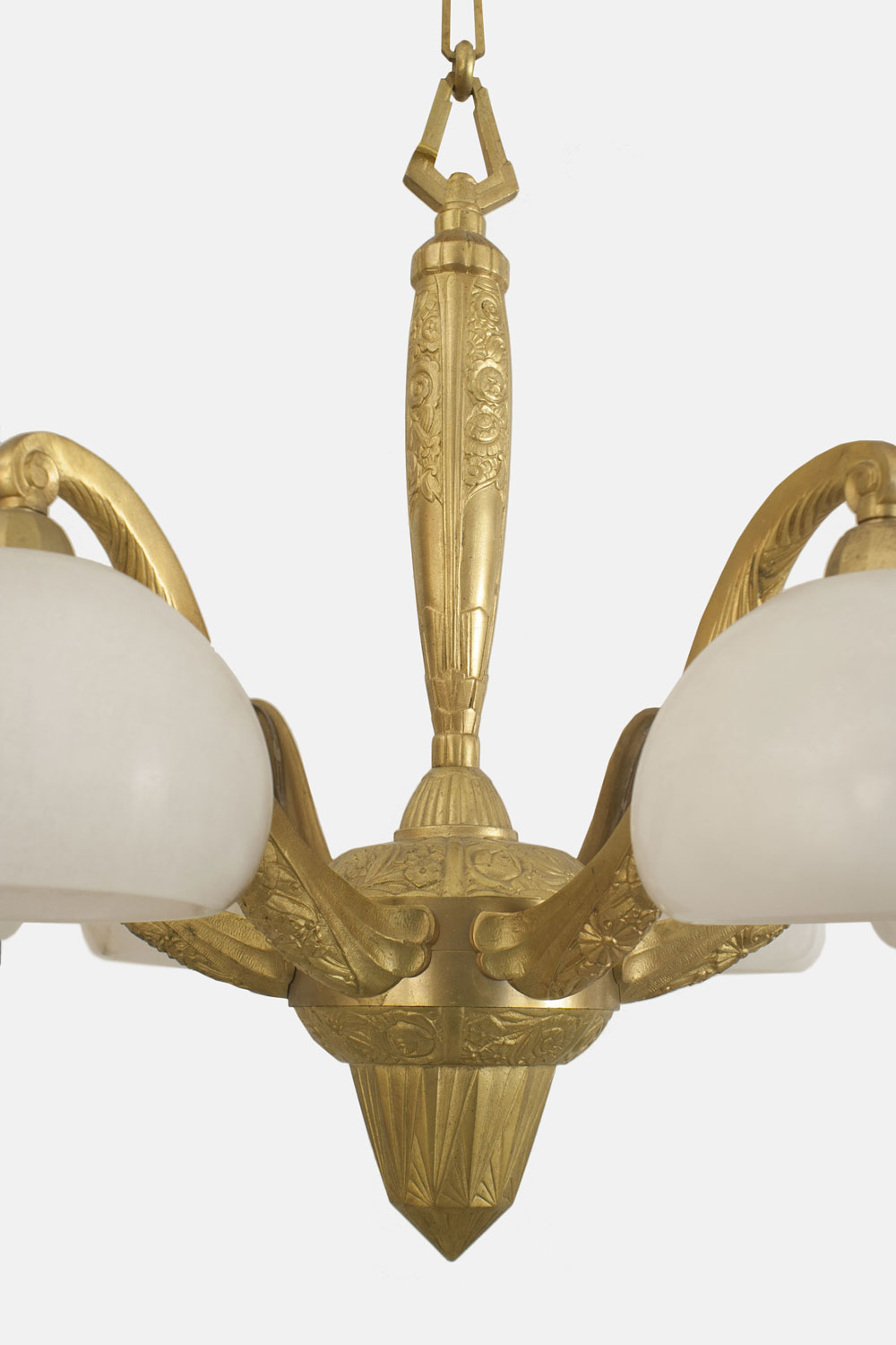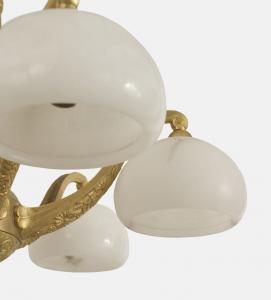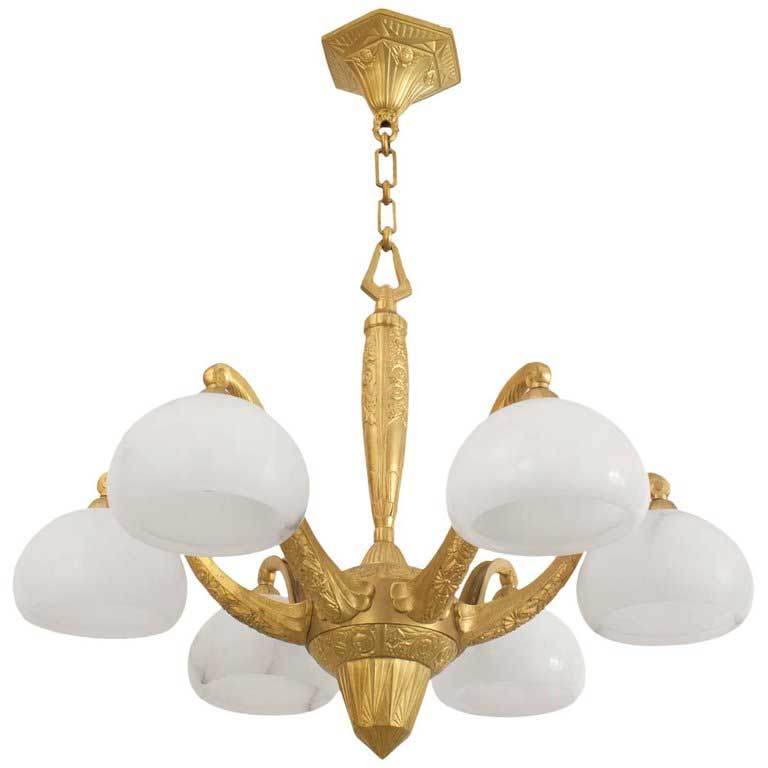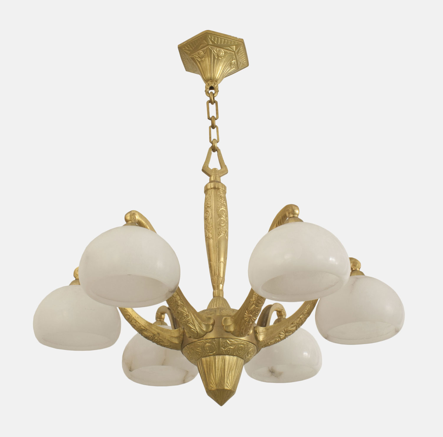 French Art Deco gilt bronze chandelier with a geometric & floral design having 6 scroll arms supporting alabaster bowl shades. (Attributed to SUE ET MARE).