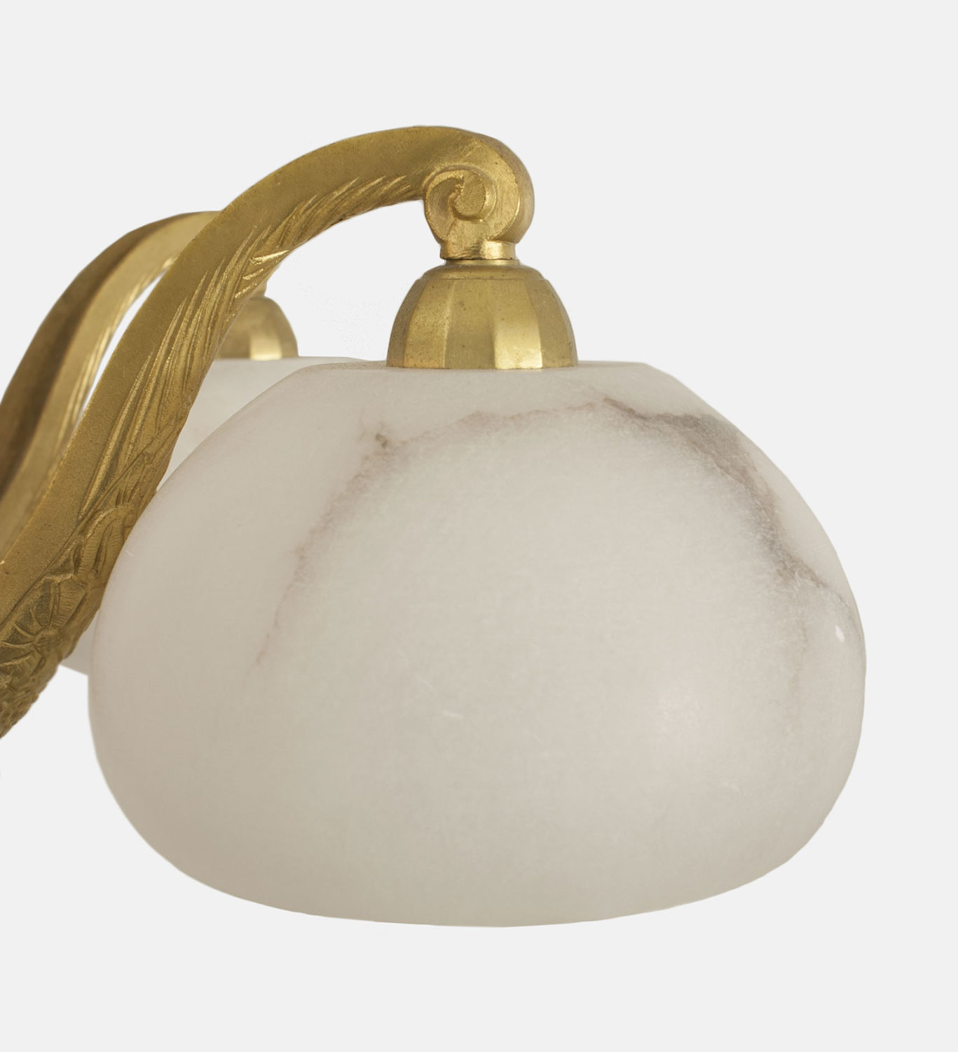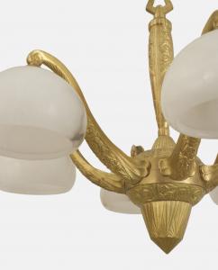 French Art Deco gilt bronze chandelier with a geometric & floral design having 6 scroll arms supporting alabaster bowl shades. (Attributed to SUE ET MARE)
