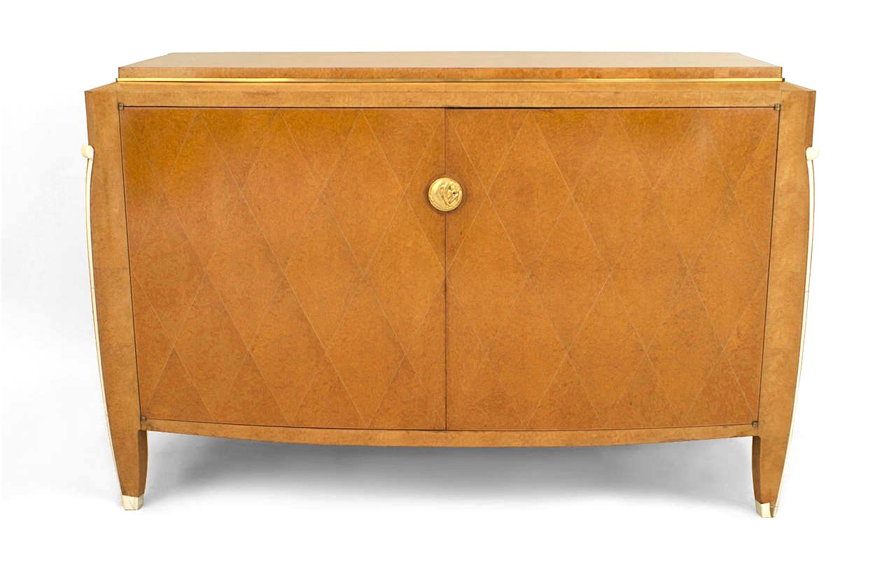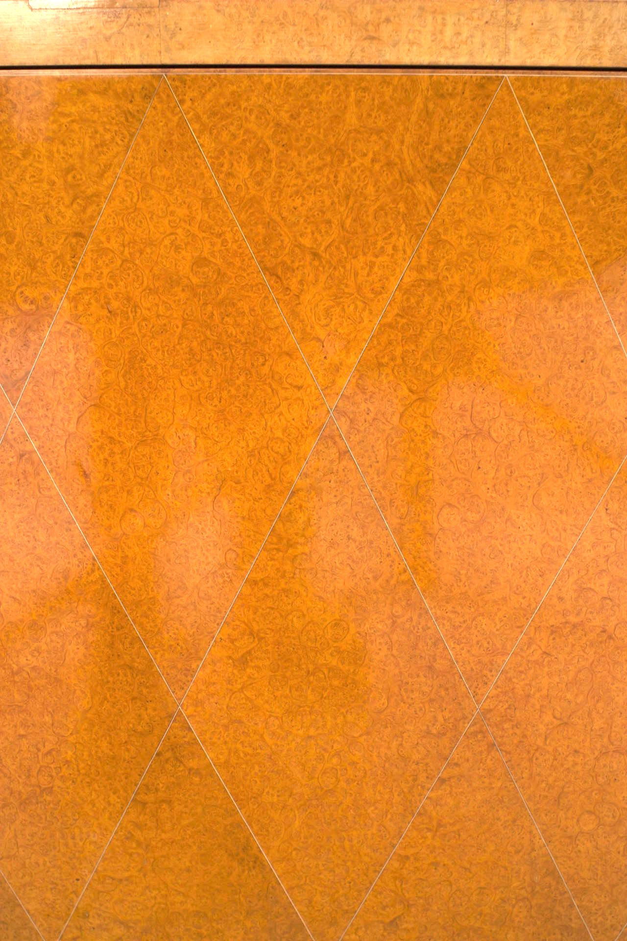 French Art Deco burled amboyna wood two door commode with bronze trim detailing with diamond design brass pencil line inlay. (Rasson model) (signed: EMILE-JACQUES RUHLMANN) NOTE: IVORY TRIM HAS BEEN REPLACED.