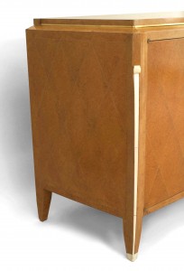 French Art Deco burled amboyna wood two door commode with bronze trim detailing with diamond design brass pencil line inlay. (Rasson model) (signed: EMILE-JACQUES RUHLMANN) NOTE: IVORY TRIM HAS BEEN REPLACED
