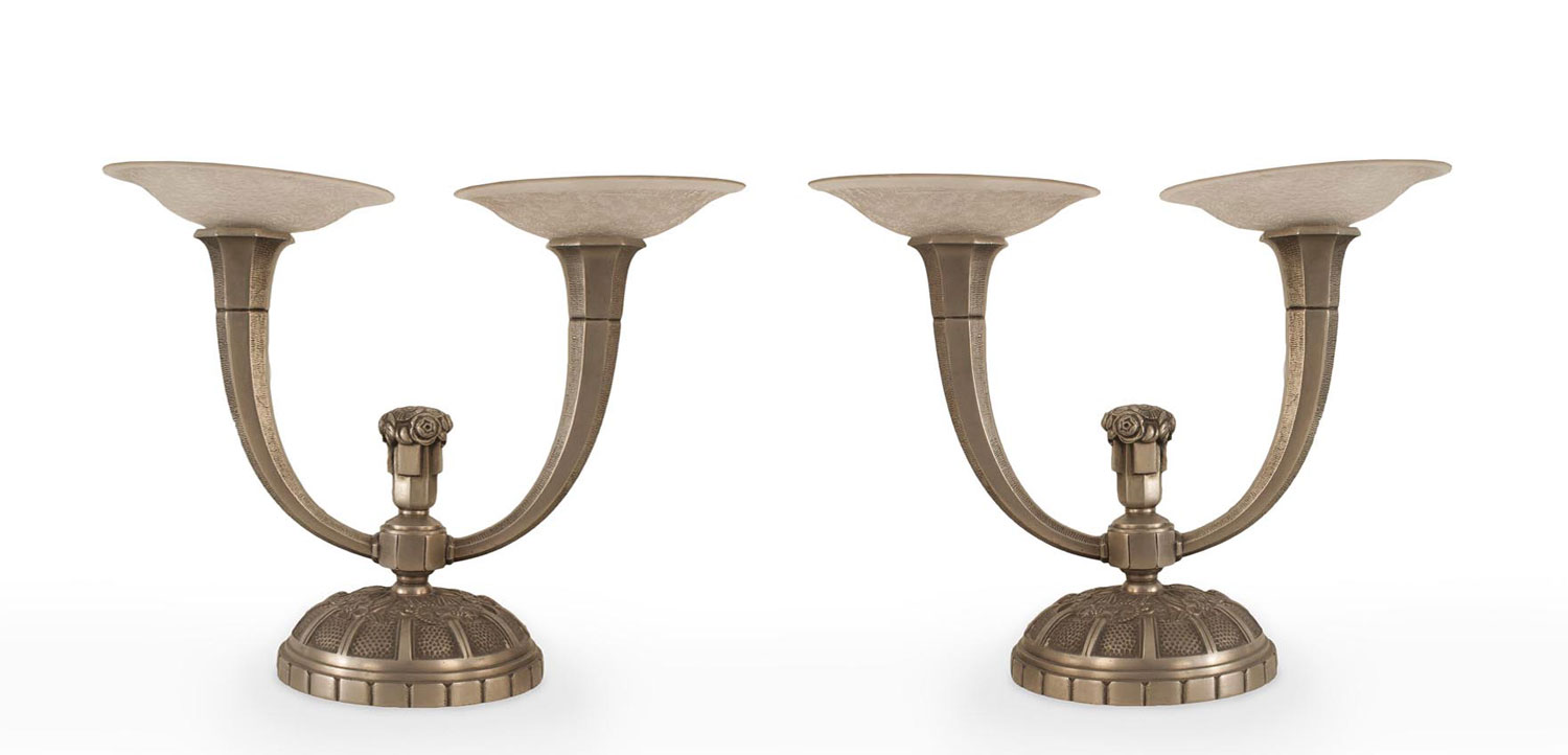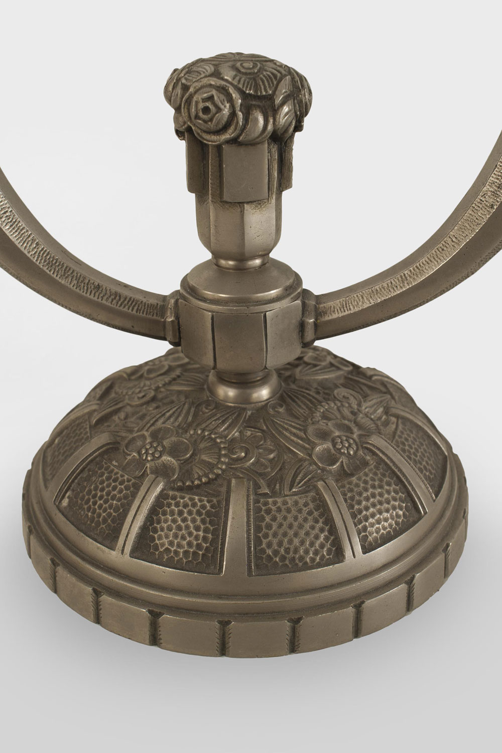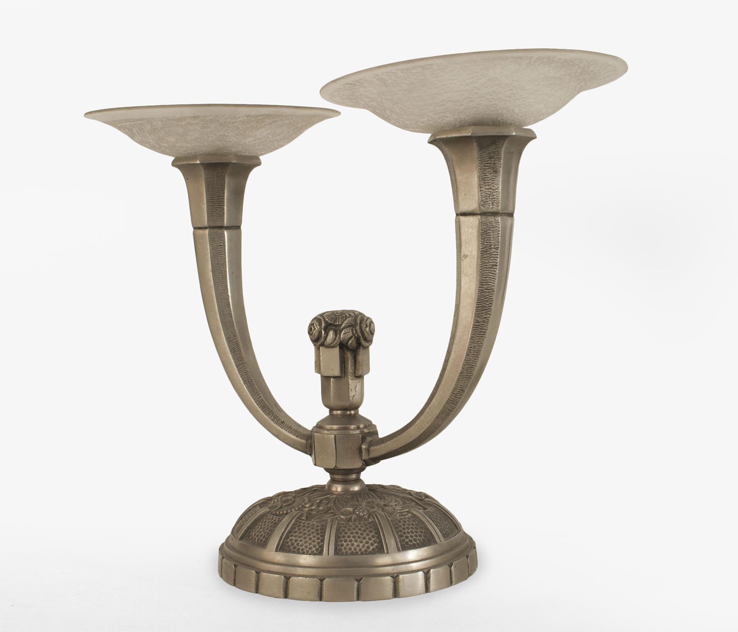 PAIR of French Art Deco nickel plated 2 arm candelabra (wired) with center finial and round base having a floral design and supporting textured frosted glass round bobeches (signed MULLER FRERES)(PRICED AS PAIR)