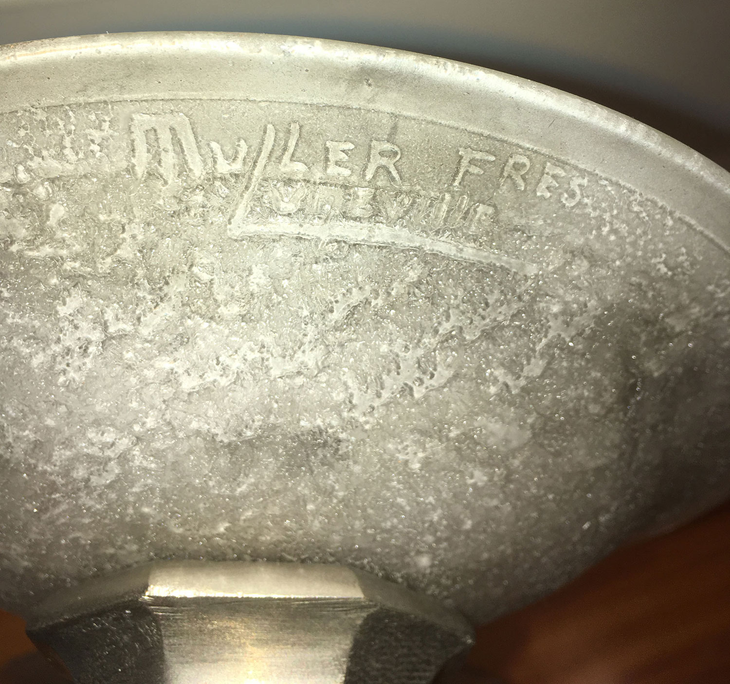 Muller Frères was a renowned French family of glassmakers and artists who made significant contributions to the field of decorative arts in the late 19th and early 20th centuries. The company, founded by Henri Muller in 1895, was based in Luneville, France. Henri Muller, along with his brothers Désiré and Eugène, established the foundation of the Muller Frères glassworks. They specialized in the production of exquisite art glass, including vases, lamps, and chandeliers. The Muller Frères glassworks quickly gained recognition for their exceptional craftsmanship and innovative designs. Inspired by the Art Nouveau movement, Muller Frères incorporated organic forms, floral motifs, and intricate patterns into their glass creations. They were particularly known for their use of acid etching and enameling techniques, which added depth and texture to their pieces. Muller Frères glassware often featured vibrant colors, including shades of blue, green, and purple, enhancing the overall aesthetic appeal. The artistic talents of the Muller brothers extended beyond glassmaking. They collaborated with prominent artists and designers of the time, such as Emile Gallé and Louis Majorelle, to create unique and harmonious pieces that combined glass with other materials like wrought iron and bronze. These collaborations resulted in a fusion of styles, showcasing the versatility and creativity of the Muller Frères brand. Muller Frères gained international acclaim and received numerous awards for their exceptional craftsmanship and artistic vision. Their glassware was showcased at prestigious exhibitions, including the Paris Exposition Universelle in 1900, where they were awarded the Grand Prix. Despite the challenges faced during World War I and the subsequent economic downturn, Muller Frères continued to produce high-quality glassware. However, the company faced financial difficulties in the 1920s, leading to its closure in 1936. Today, Muller Frères glassware remains highly sought after by collectors and enthusiasts of Art Nouveau and decorative arts. Their innovative designs and meticulous craftsmanship continue to inspire and influence contemporary glassmakers and artists. The legacy of Muller Frères lives on as a testament to their significant contributions to the world of decorative arts.
