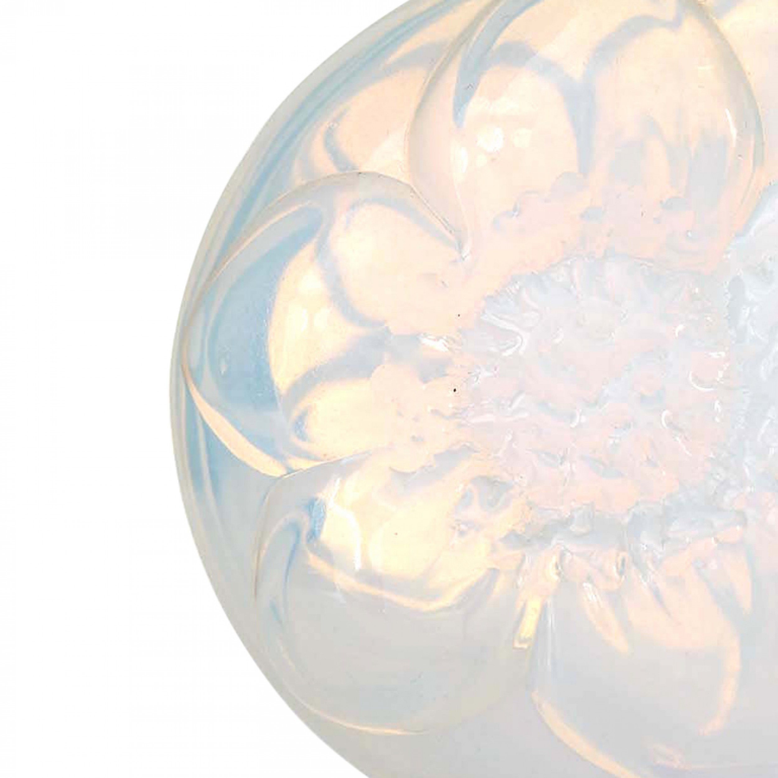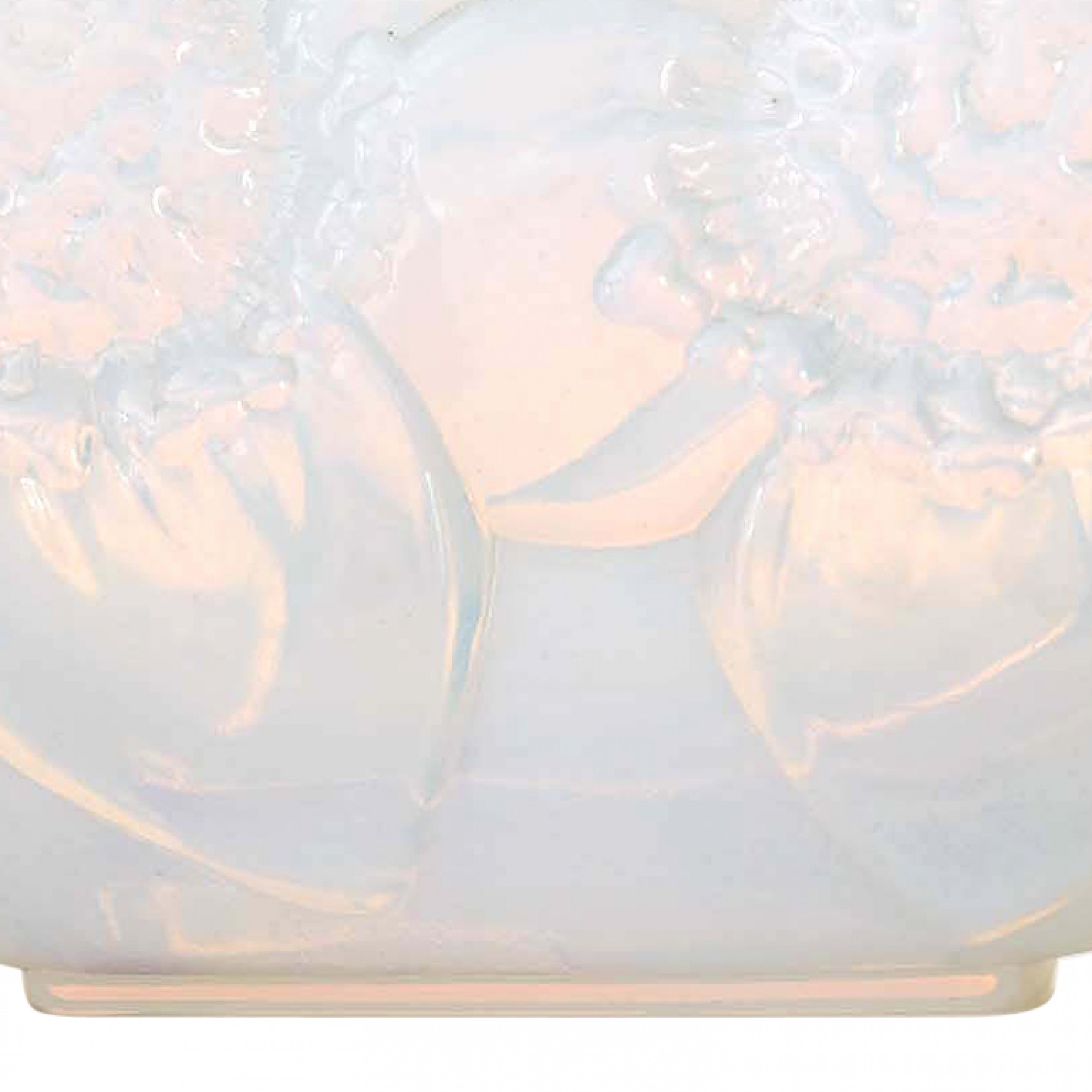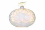 French Art Deco oval opalescent glass bottle with embossed flowers, perfume name "Vœu de Noël" written in gold, and a cylindrical stopper with brand name "CARON"