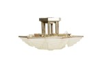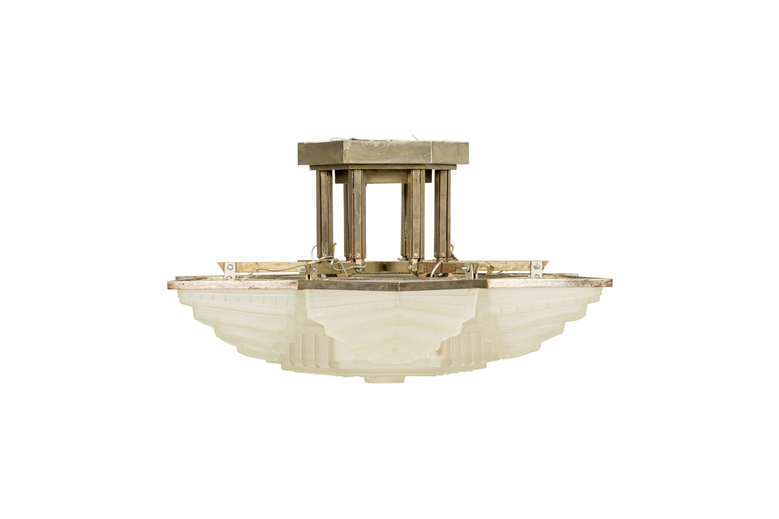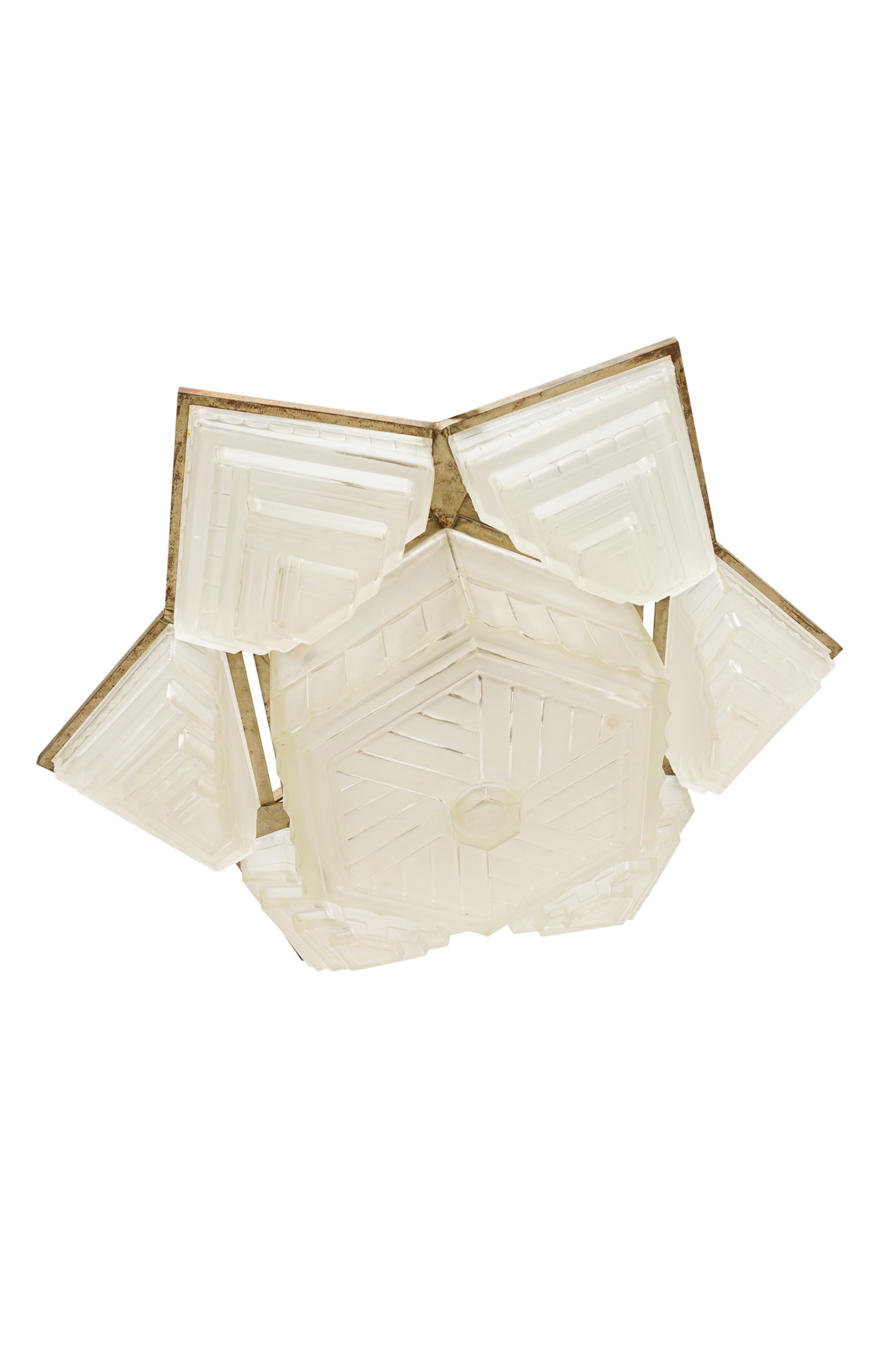 French Art Deco chandelier with 6 shades and a large centered 6-sided geometric frosted shade