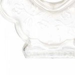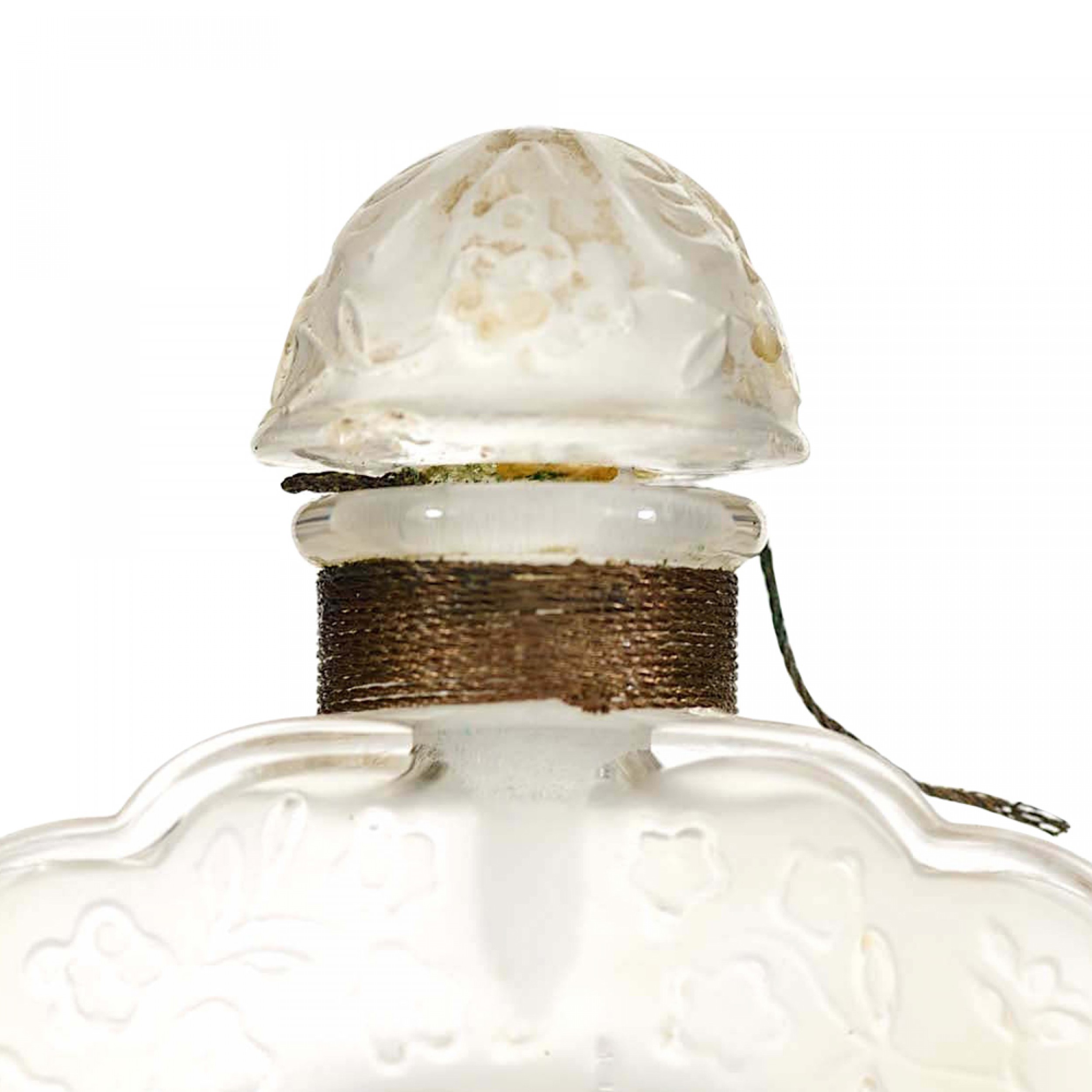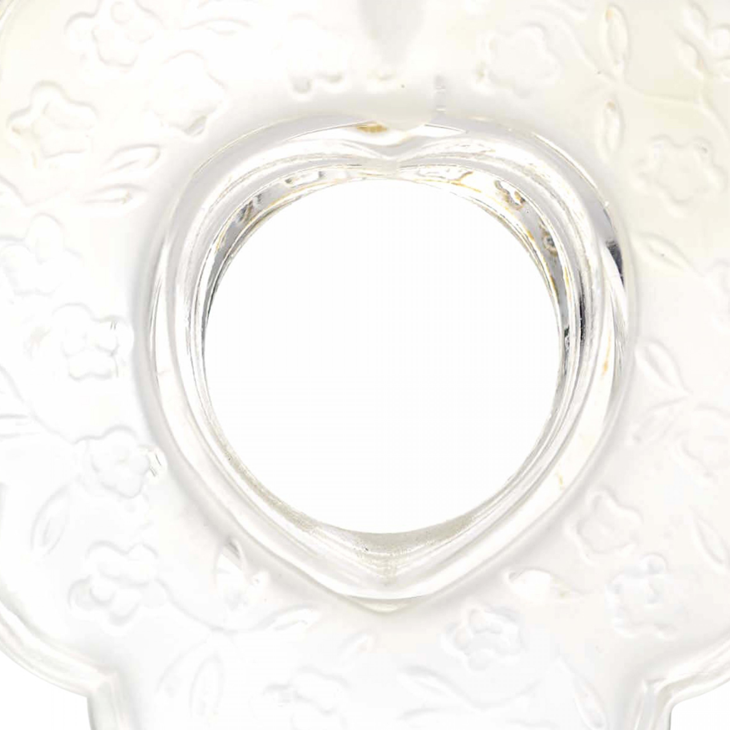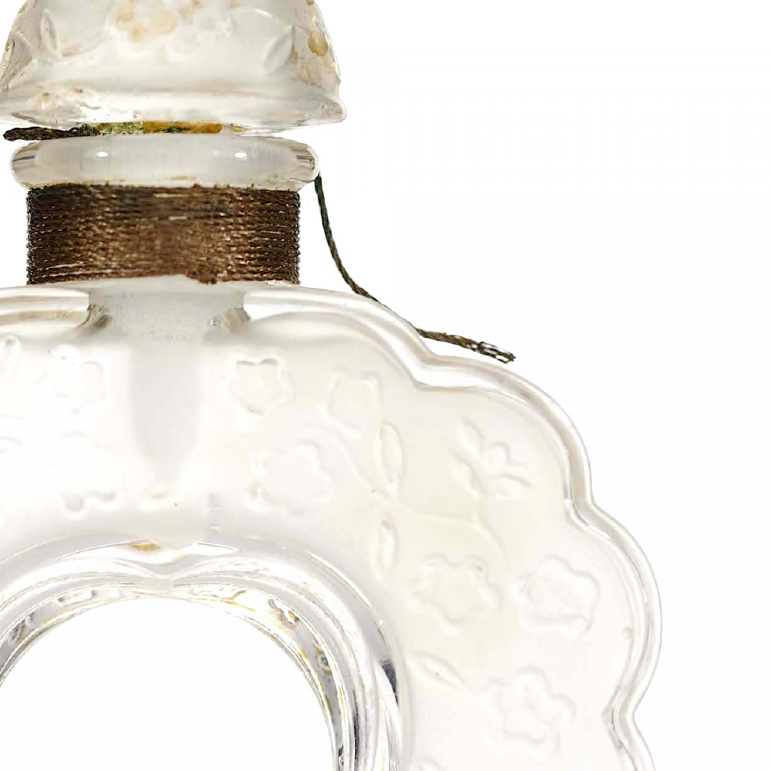 French Art Deco scalloped clear glass perfume bottle (COEUR JOIE by NINA RICCI) with a heart shaped opening in the center, embossed floral design, and a dome-shaped stopper (signed LALIQUE "Joie de Vivre").