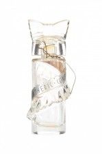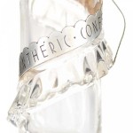 French Art Deco cylindrical clear glass perfume bottle (CONFETTI by LENTHERIC) with molded ruffles and a silver label winding around the body and a bow shaped stopper.