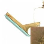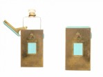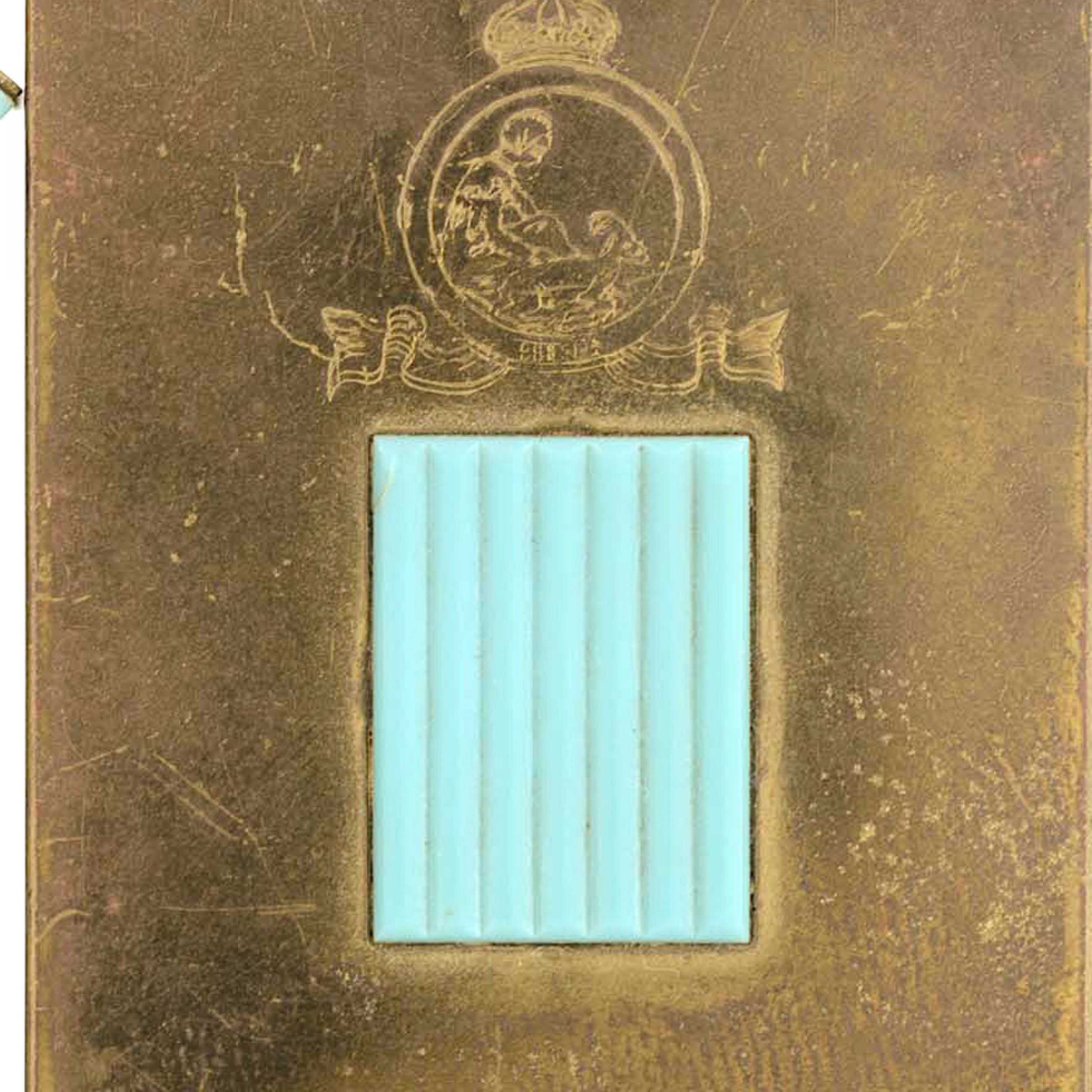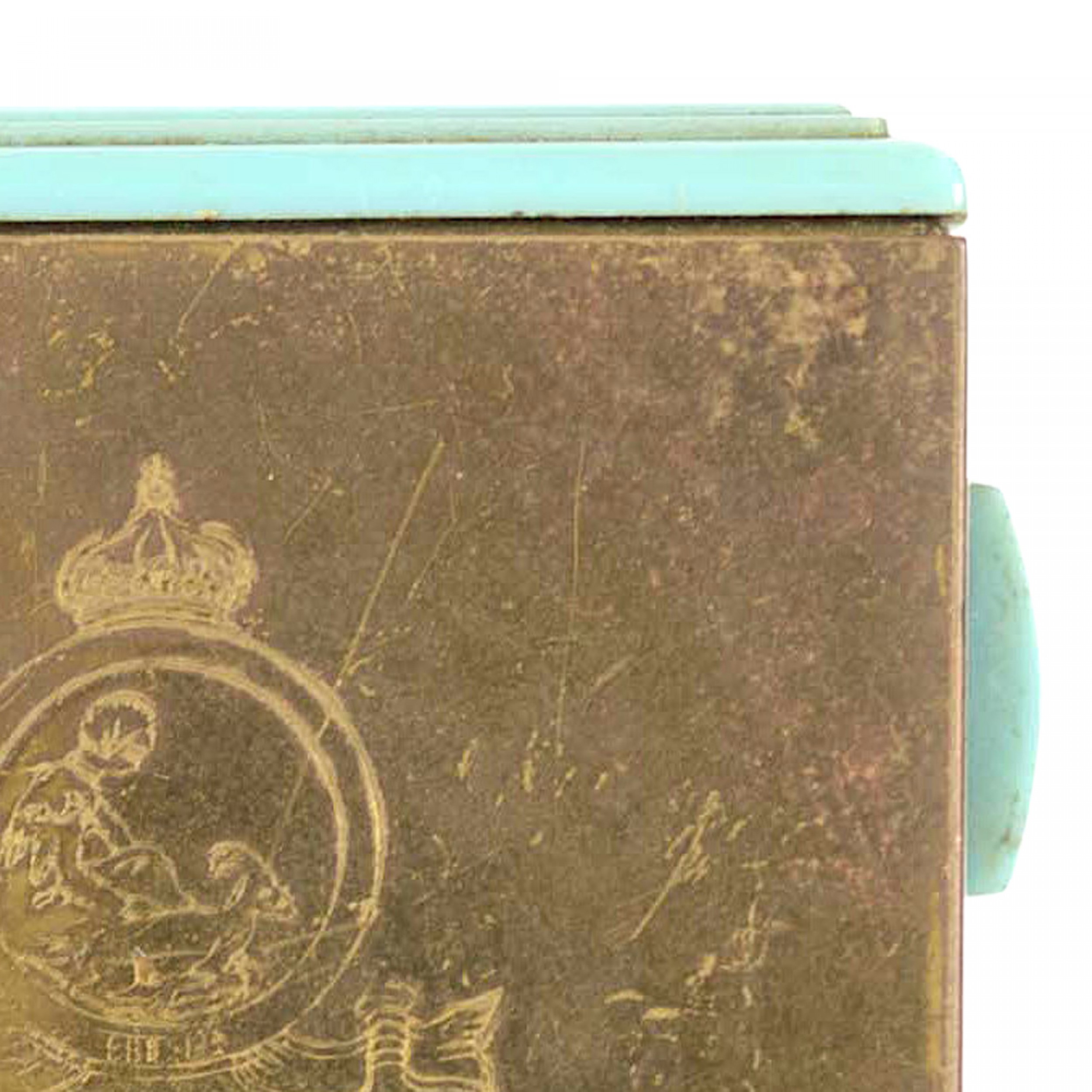 Vintage French Art Deco small glass perfume bottle (by COTY (L'Aimant) in a rectangular brass case with a turquoise bakelite top..