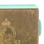 Vintage French Art Deco small glass perfume bottle (by COTY (L'Aimant) in a rectangular brass case with a turquoise bakelite top.