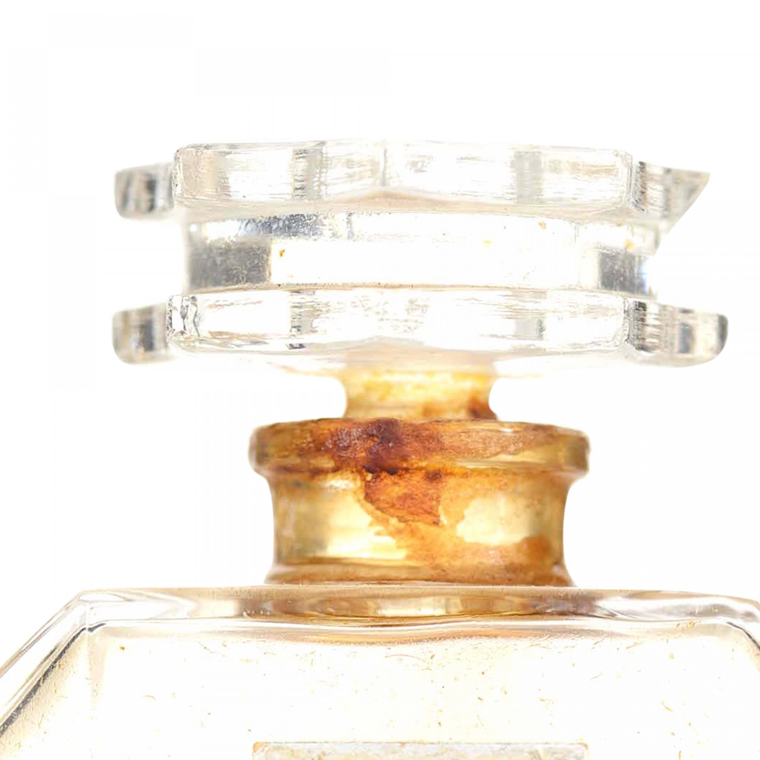 French Art Deco faceted clear glass perfume bottle (CREPE DE CHINE by F. MILLOT) with a gold label and a star-shaped stopper.