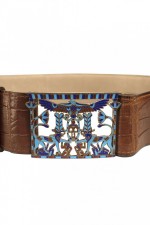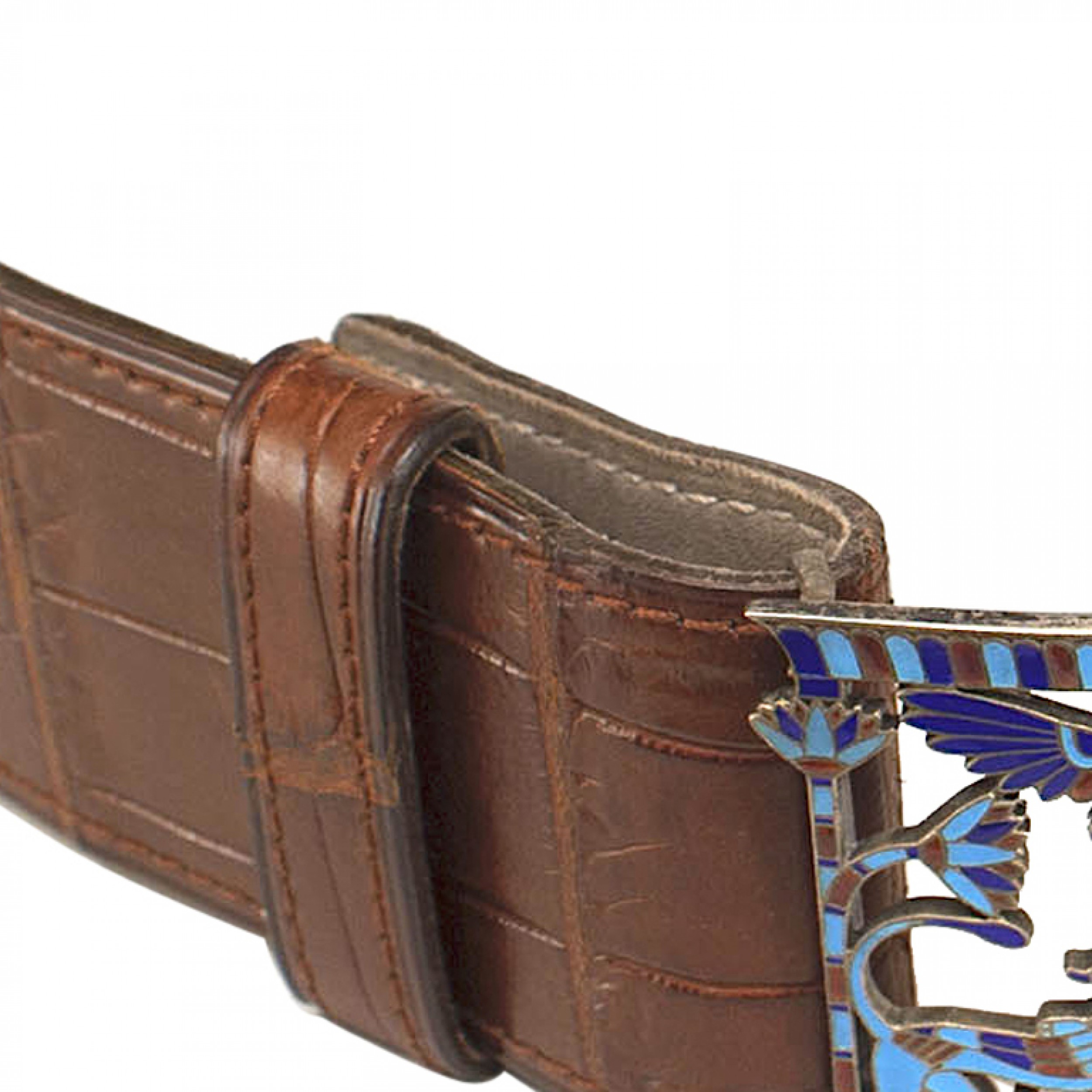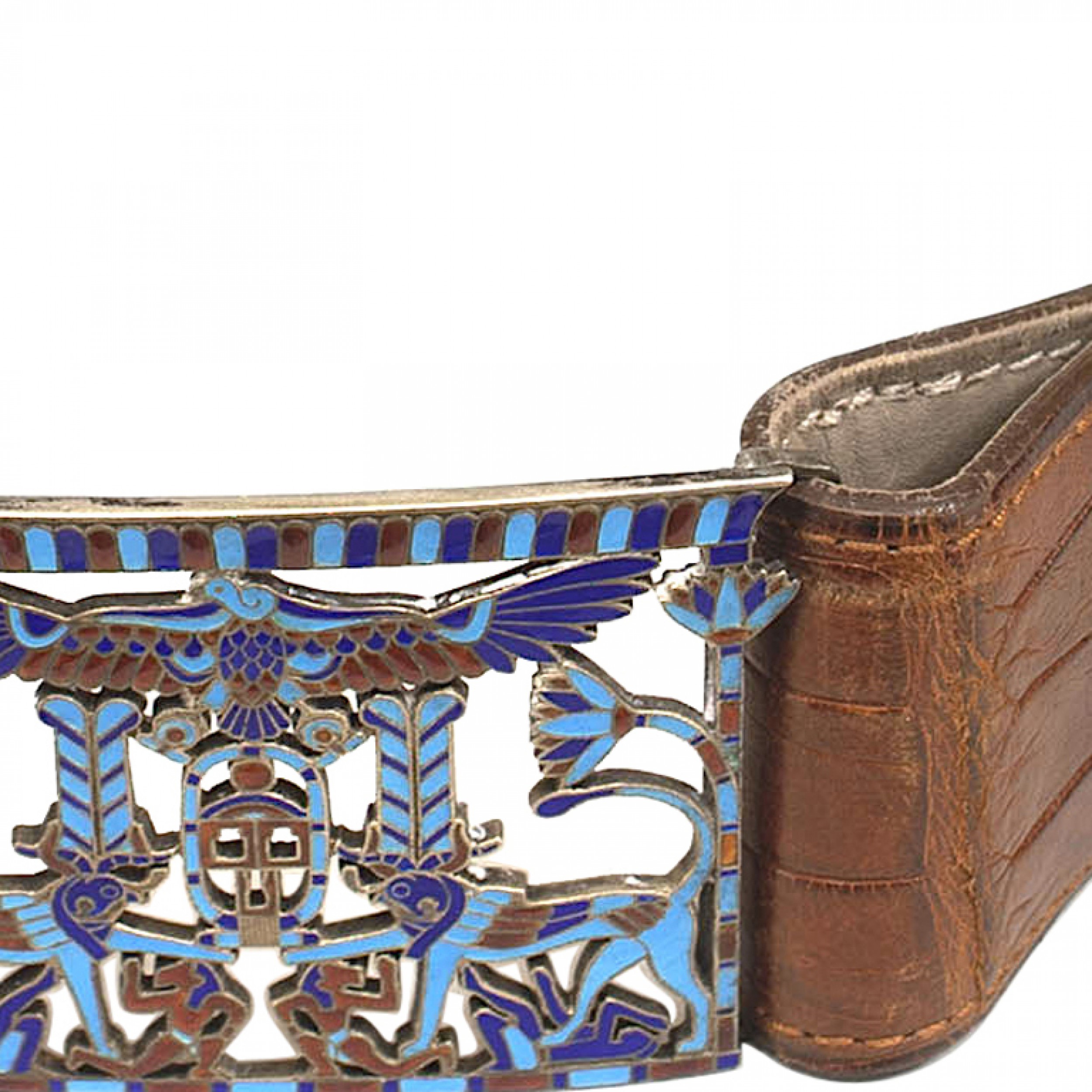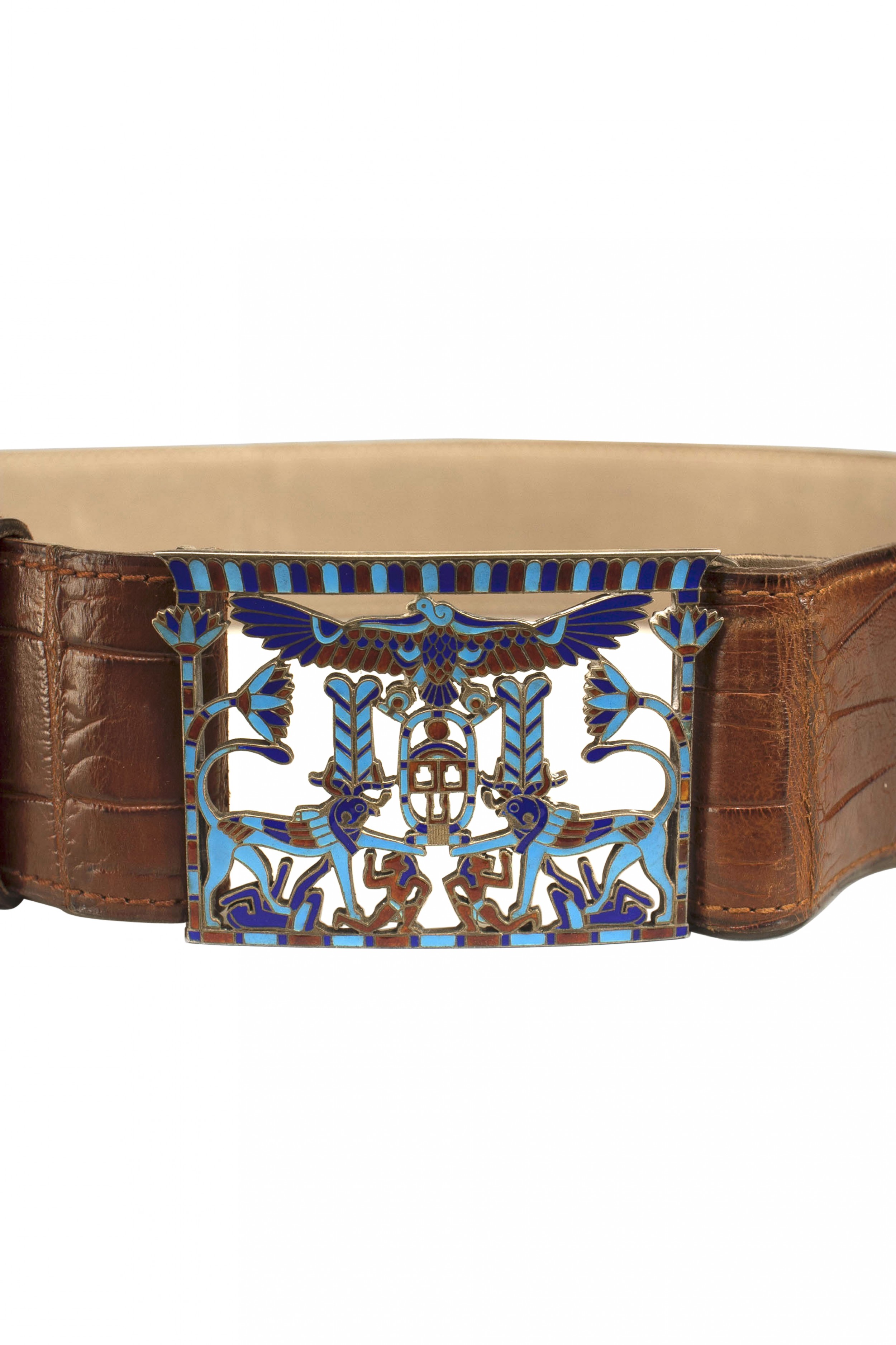 French Art Deco crocodile belt with an Egyptian themed cloisonné buckle.