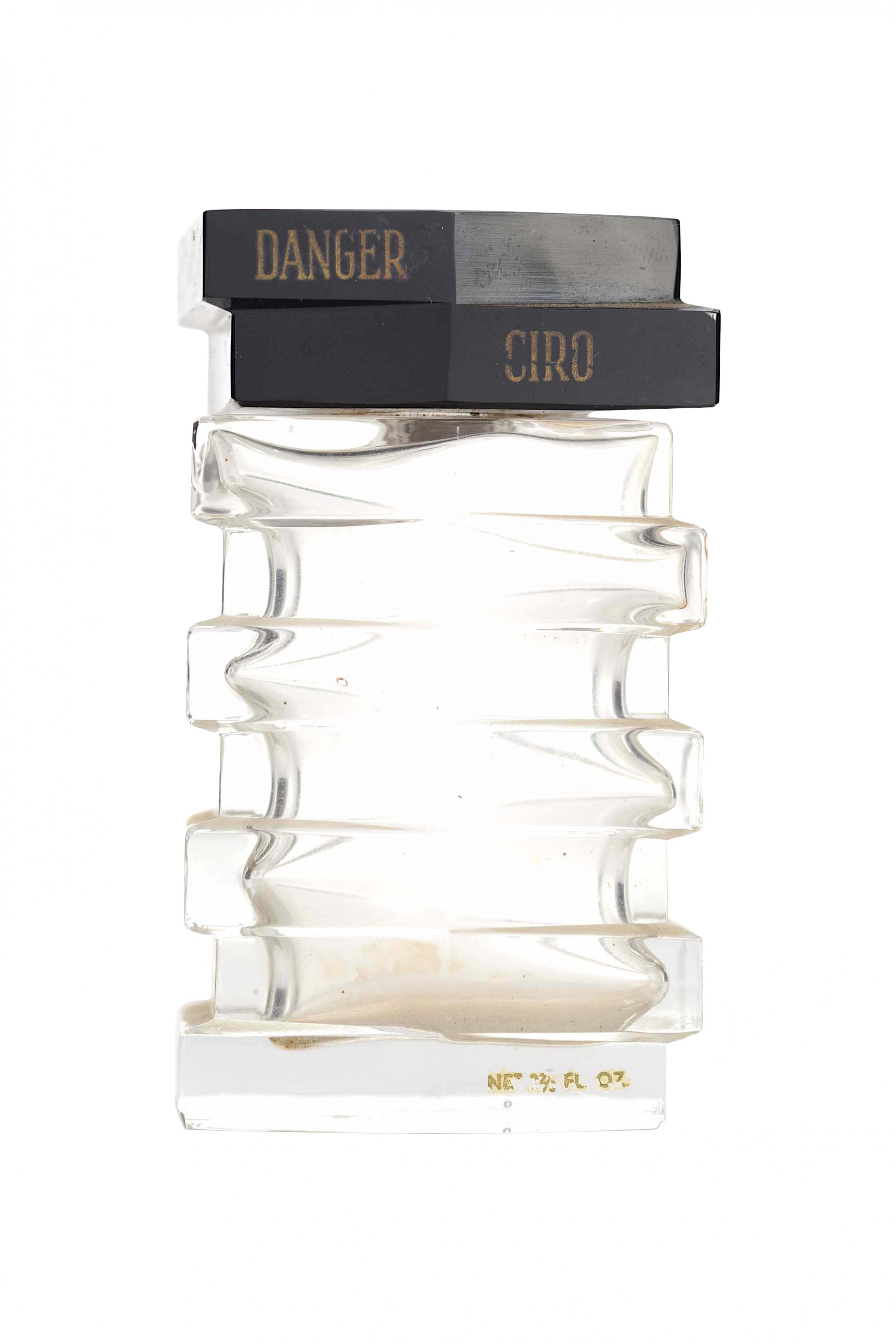 French Art Deco clear glass perfume bottle ("DANGER" for CIRO) shaped like stacked rectangles, with a matching black plastic stopper. (by Verreries Brosse).