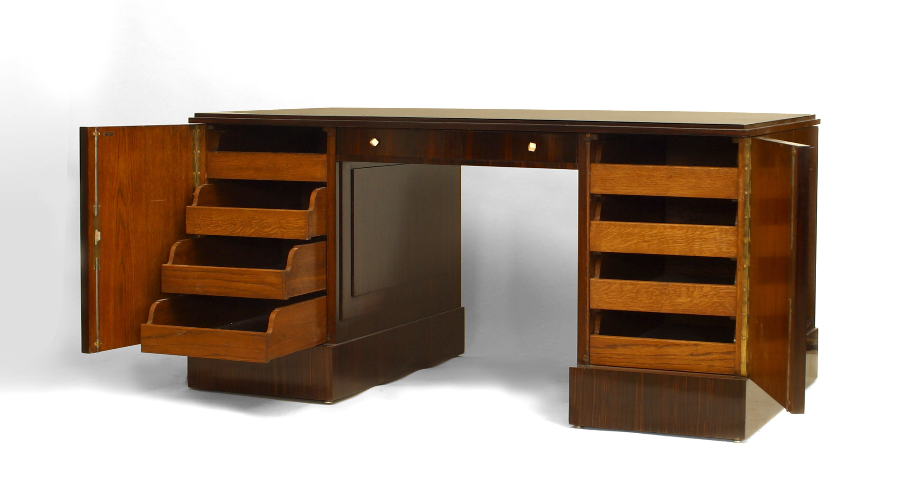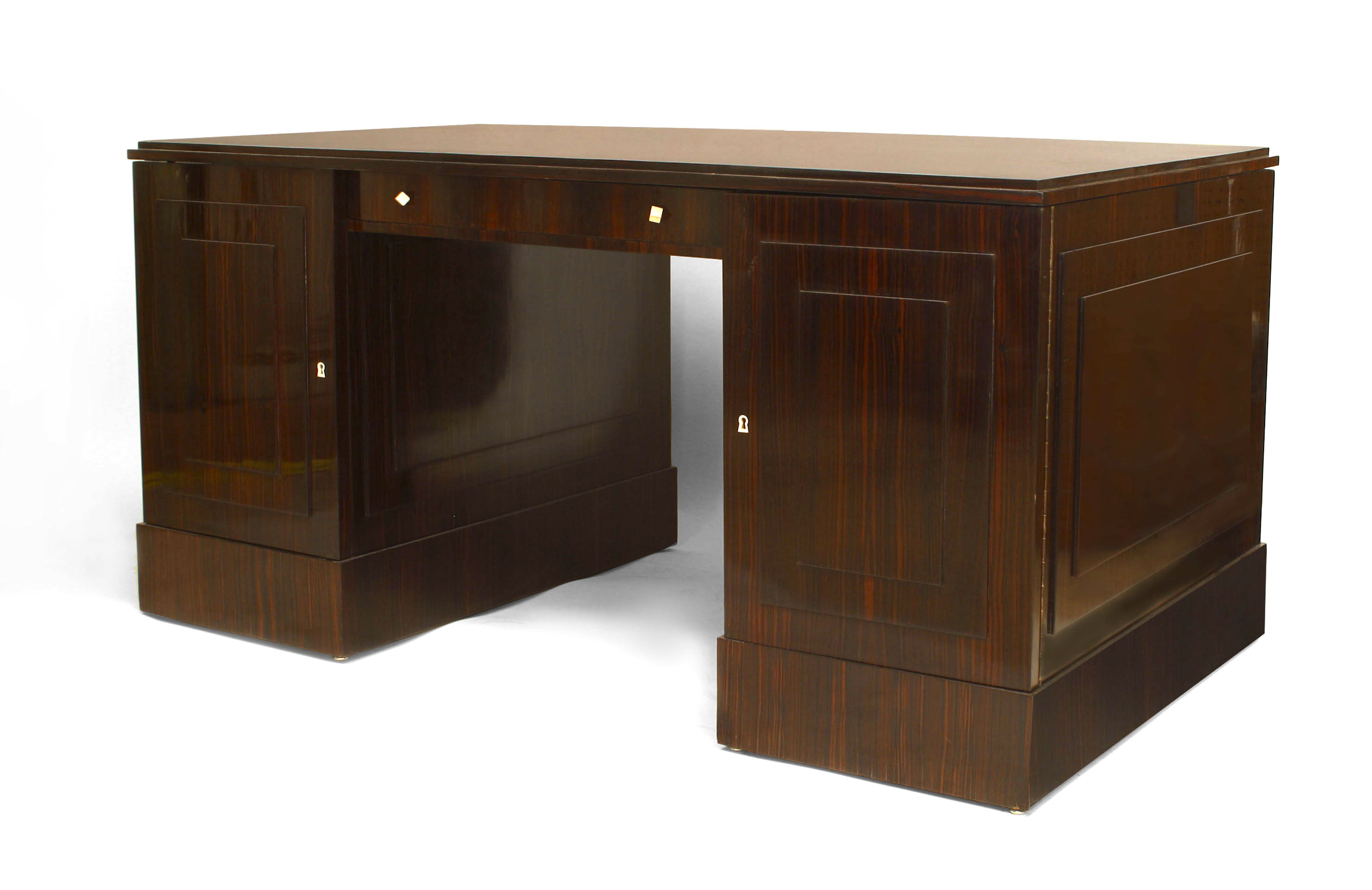 French Art Deco calamander wood double pedestal base desk having doors opening to drawers & shelves with trim. (Matching pair & single bookcase REG0038/REG0039). (signed: DOMINIQUE).