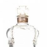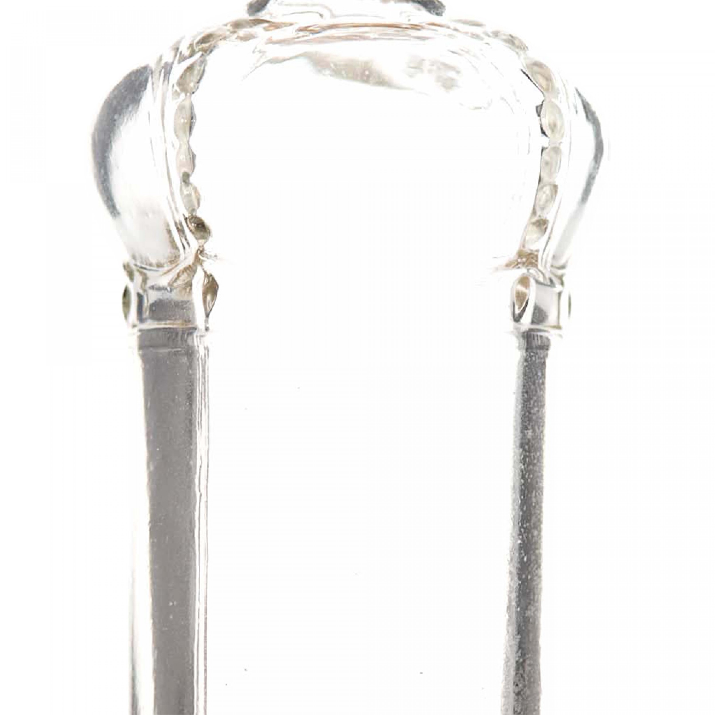 French Art Deco cylindrical clear glass perfume bottle (DUCHESS OF YORK by PRINCE MATCHABELLI) with a flared base, a crown-shaped top and a frosted glass Maltese cross shaped stopper.