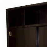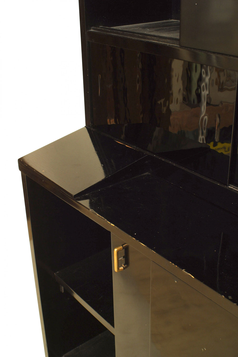 French Art Deco ebonized 2-section bookcase cabinet with top section having sliding glass and lacquered doors above a base with 2 doors (Manner of Pierre Chareau).