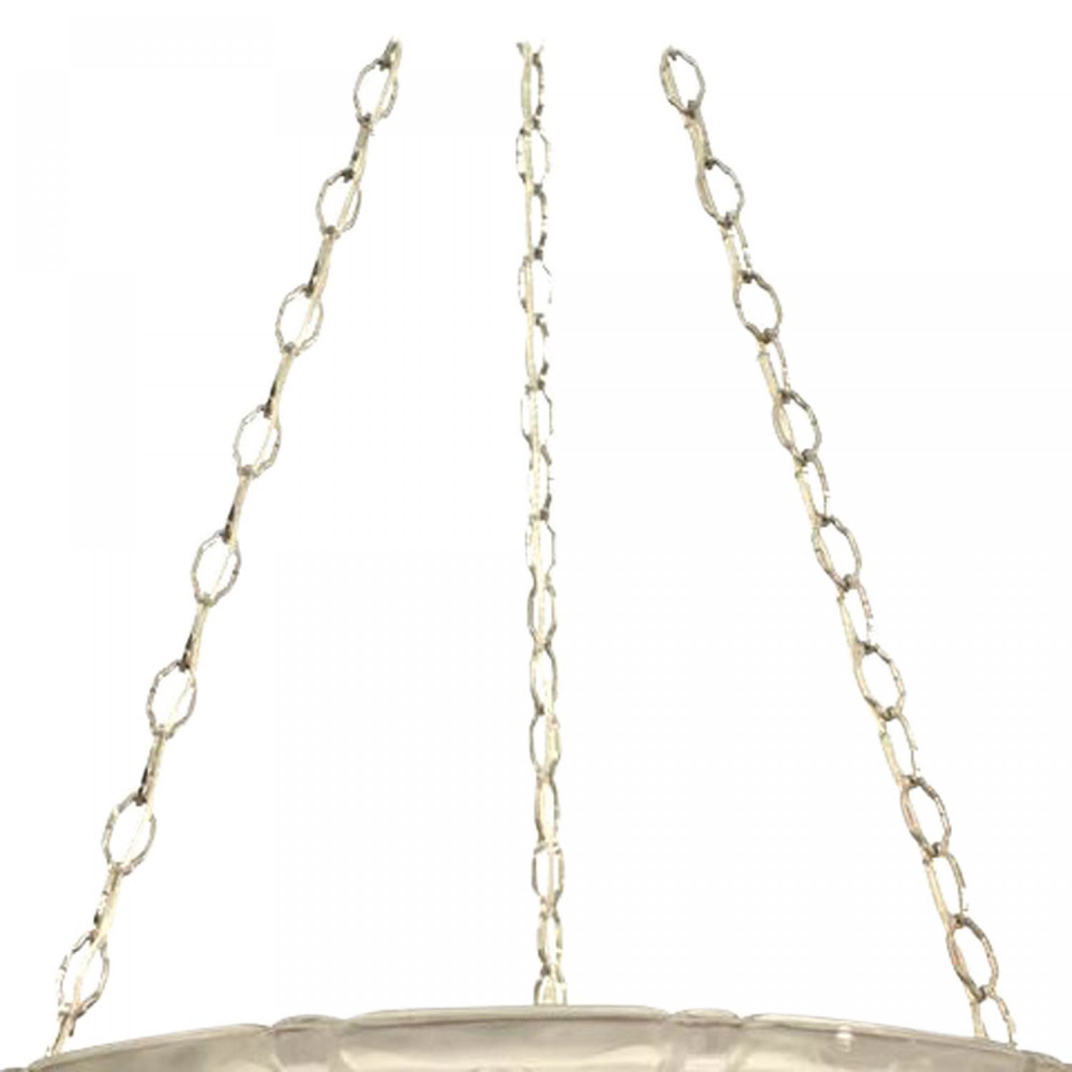 French Art Deco (circa 1925) etched palm and leaf round flared pendant form glass dome shaped chandelier suspended from 3 chrome chains. (LORANE NANCY)