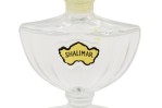 French Art Deco urn-shaped glass perfume bottle with a fan-shaped blue-tinted glass stopper, with brand name "Guerlain" written in gold and a silver sticker with perfume name "Shalimar" (signed BACCARAT).