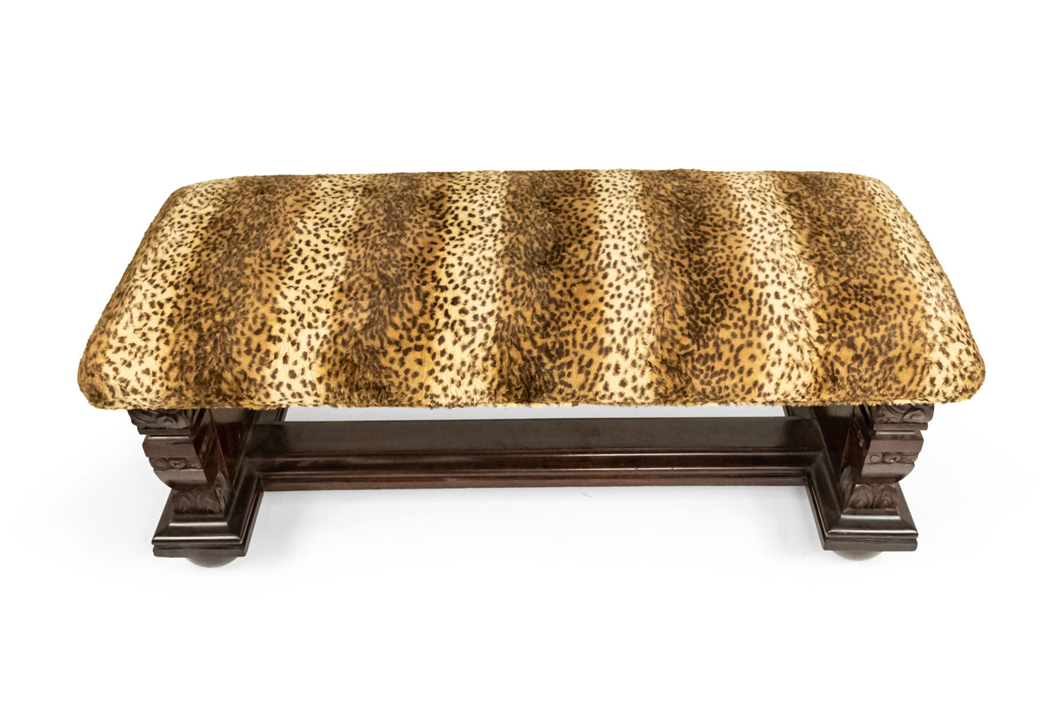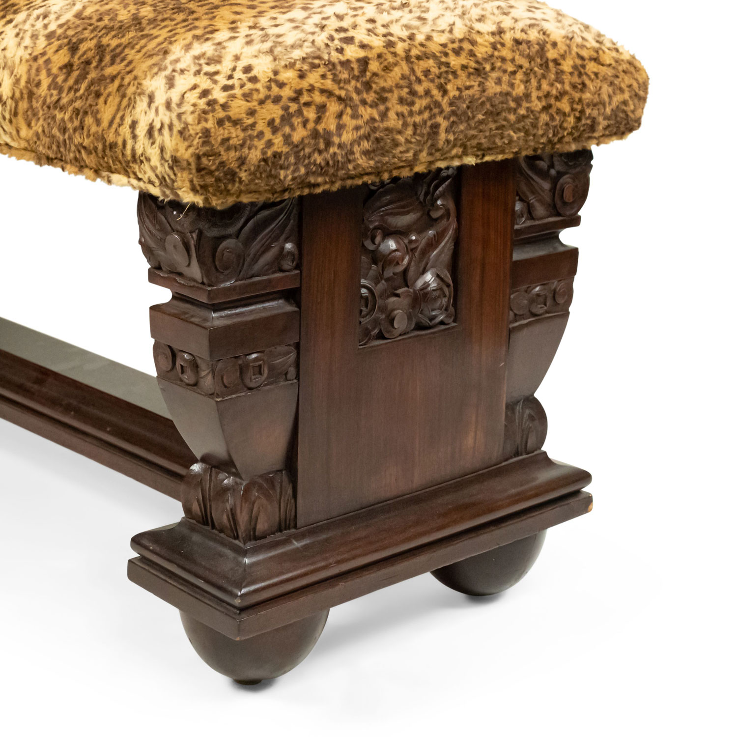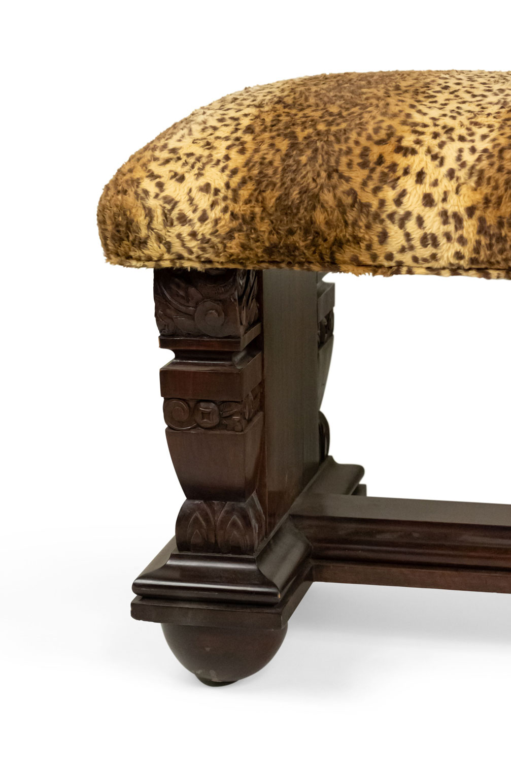 French Art Deco palisander wood double pedestal base rectangular bench with stretcher & carved floral supports and faux leopard upholstered seat.