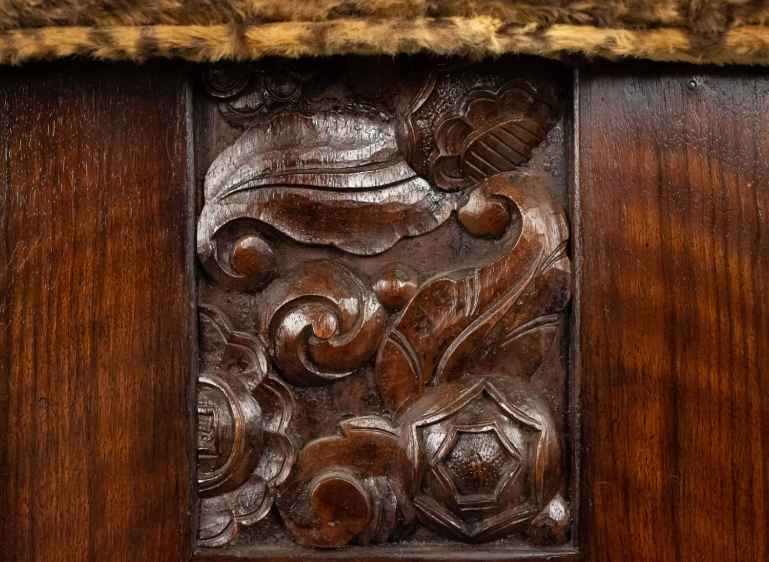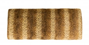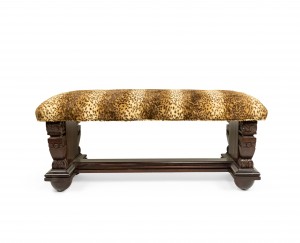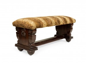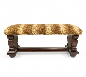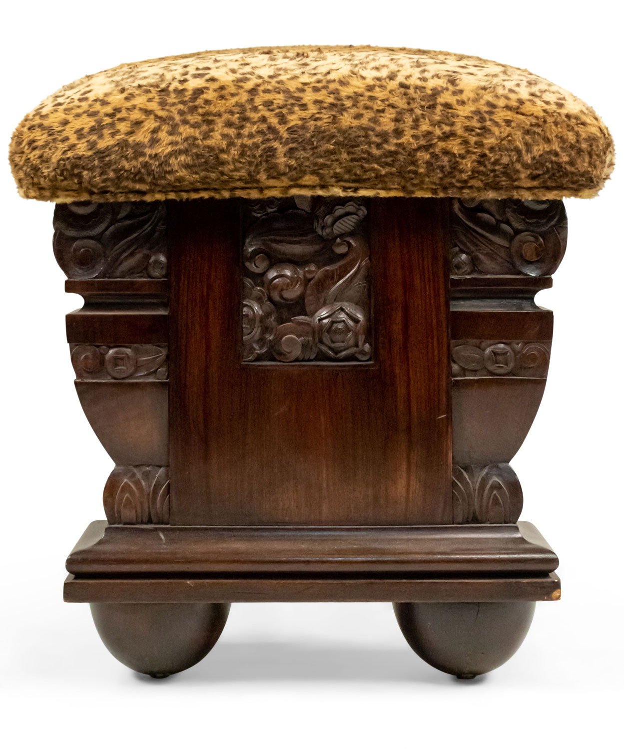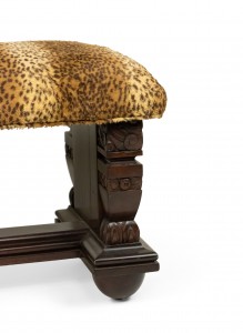 French Art Deco palisander wood double pedestal base rectangular bench with stretcher & carved floral supports and faux leopard upholstered seat.
