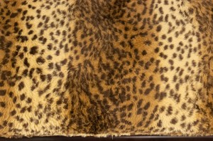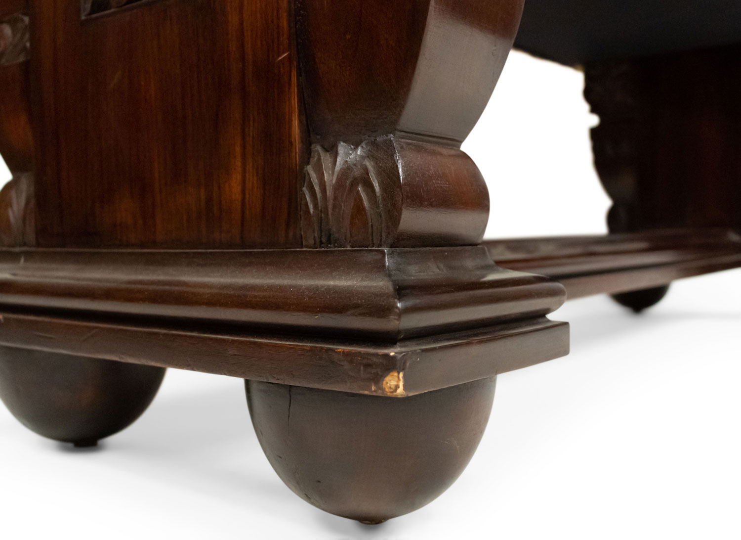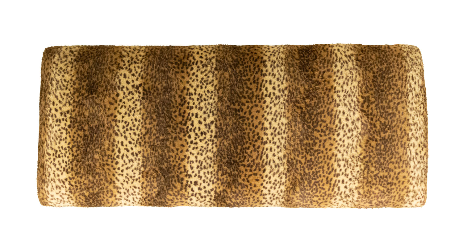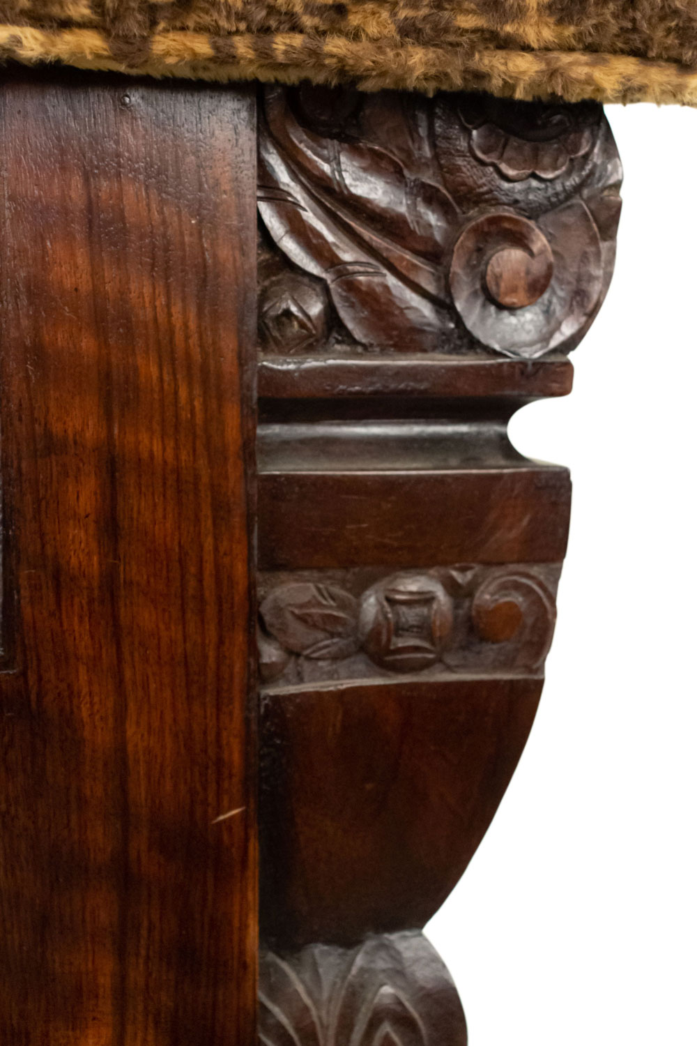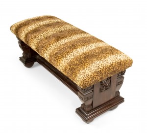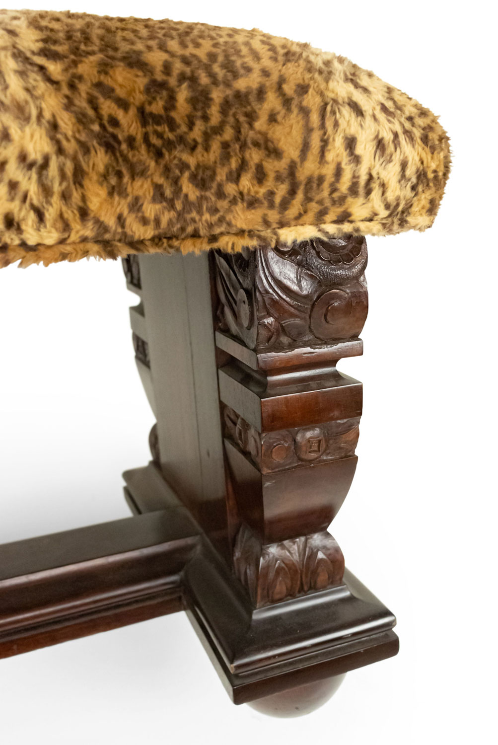 French Art Deco palisander wood double pedestal base rectangular bench with stretcher & carved floral supports and faux leopard upholstered seat..