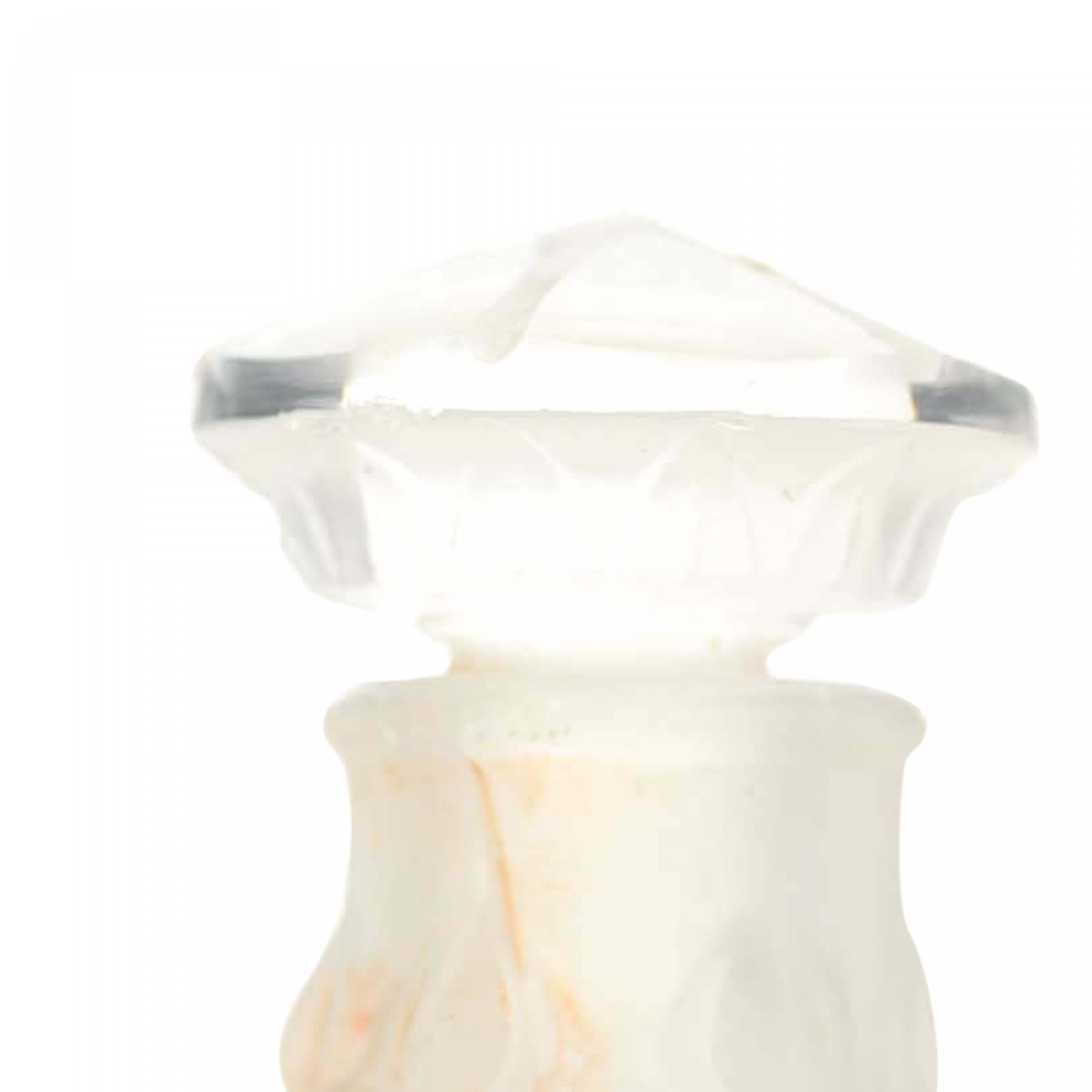 French Art Deco hexagonal clear and frosted glass perfume bottle (FLASCÓ 5466 by DÉPINOIX) with molded design between the faces, and a matching stopper. Designed by JULIEN VIARD (AS IS - various chips).