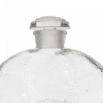 French Art Deco disk-shaped glass perfume bottle (RELIEF by FORVIL) with a design of repeating raised spirals and a matching stopper (signed LALIQUE).