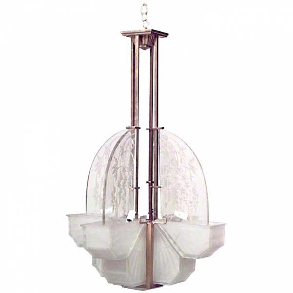 French Art Deco frosted glass 4 corner chandelier with etched floral design panels. (signed: ATELIER VINCENT)