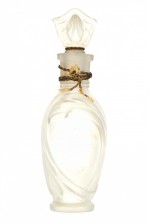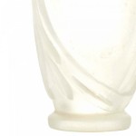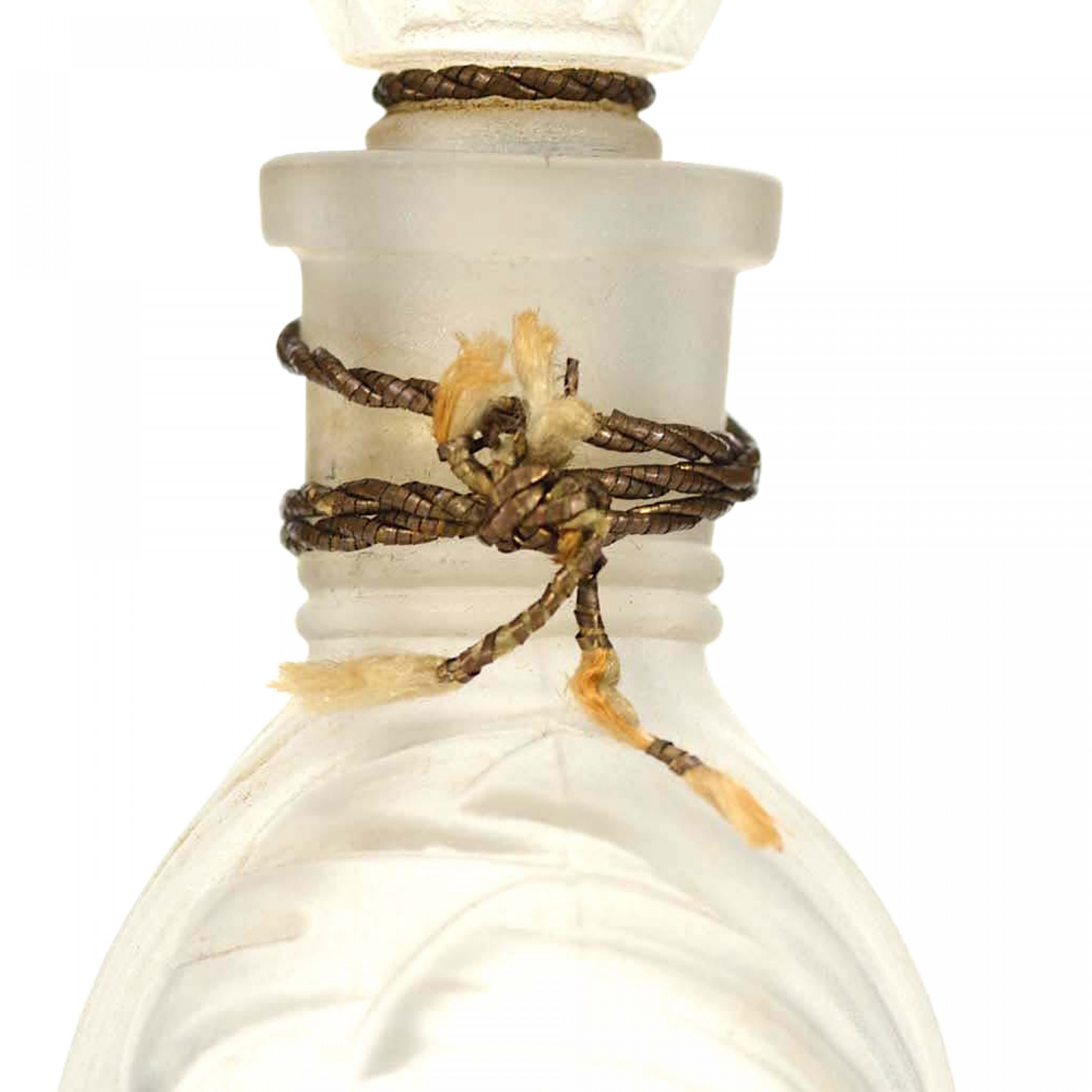 French Art Deco ovoid frosted glass perfume bottle with molded decorative design and a matching stopper.