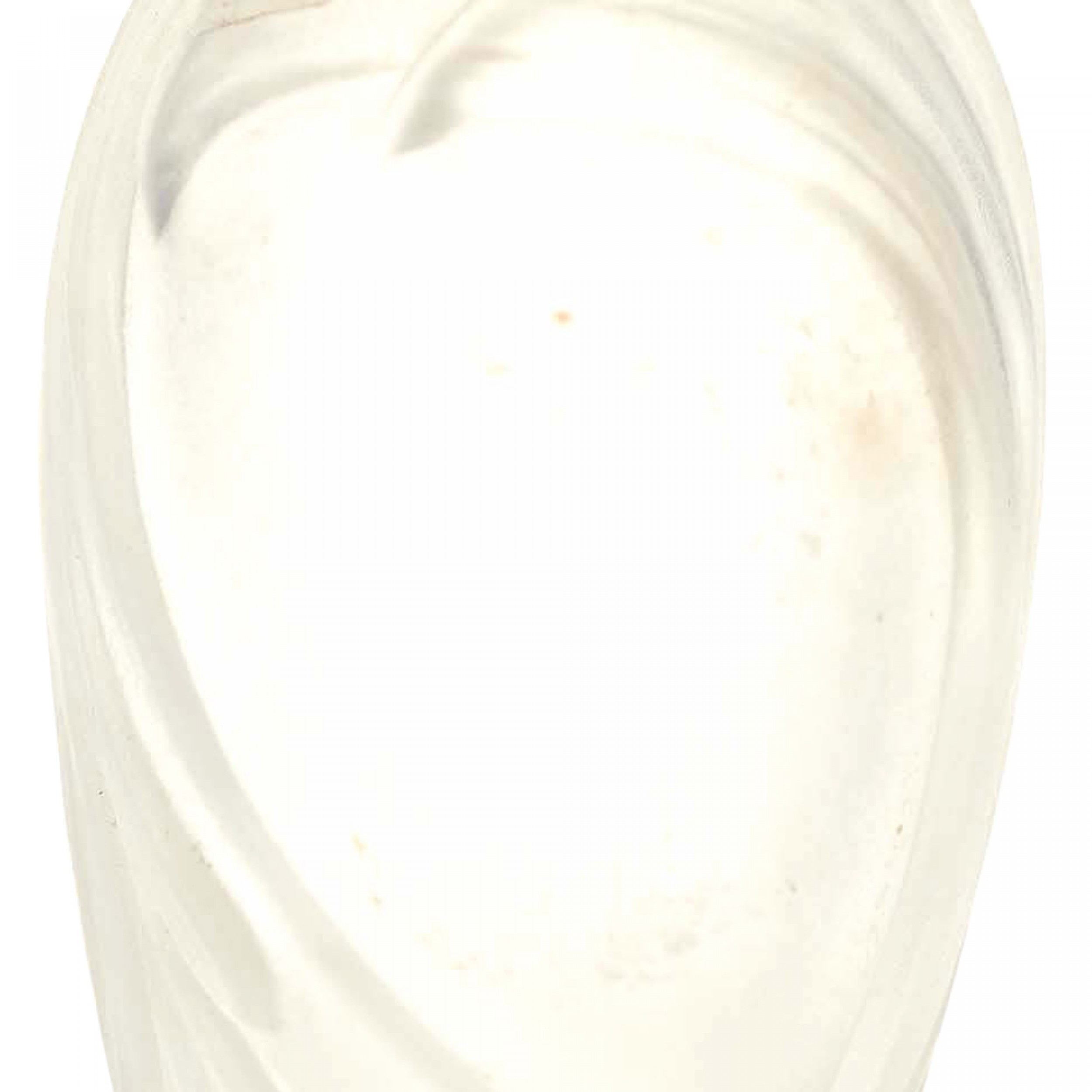 French Art Deco ovoid frosted glass perfume bottle with molded decorative design and a matching stopper..