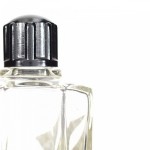 French Art Deco faceted clear glass perfume bottle with enameled geometric design in green and silver and a black plastic twist-off cap. (2-PRICED EACH)